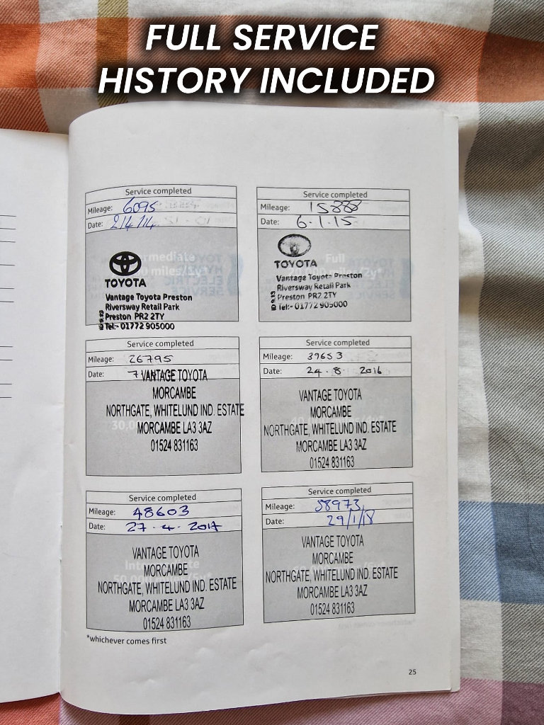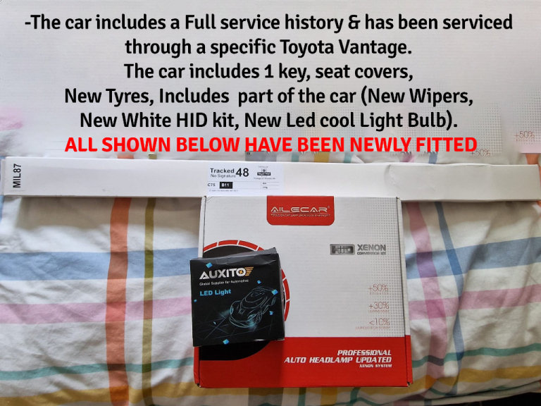 --The car includes a full service history & has been serviced through a specific Toyota Vantage. The car includes 1 key, seat covers, New Bridge Stone Tyres, Fron & Rear New Break pad/disc, New Front Shark and part of the car (New Wipers, New White HID kit, New Led cool Light Bulb). ALL HAVE BEEN NEWLY FITTED