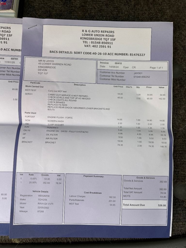 Recent engine service with invoice £520 + water pump & rocker cover gasket replacement- £190.