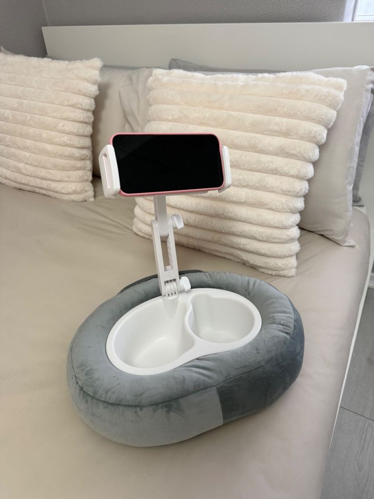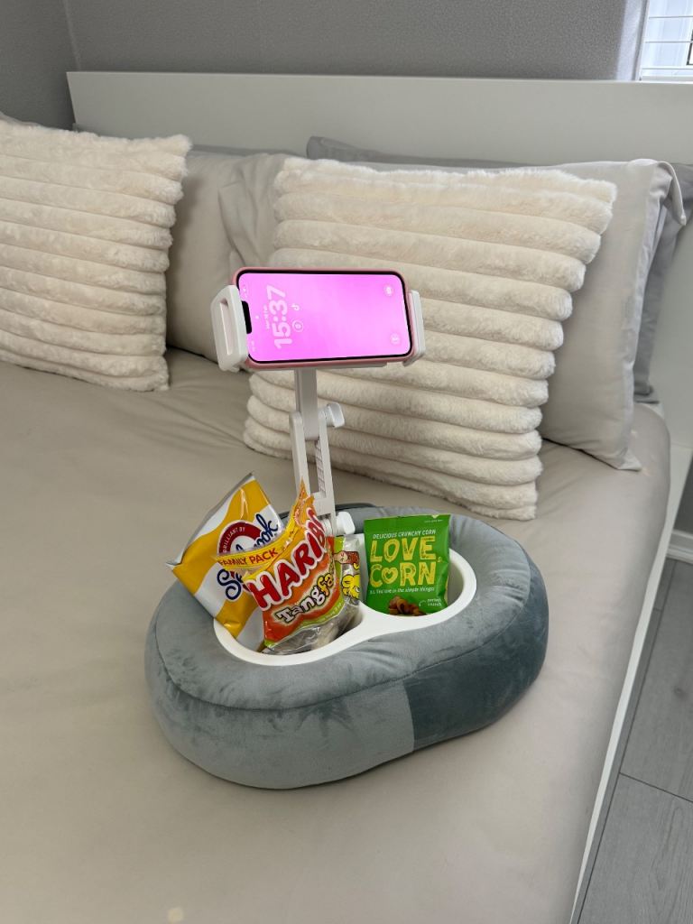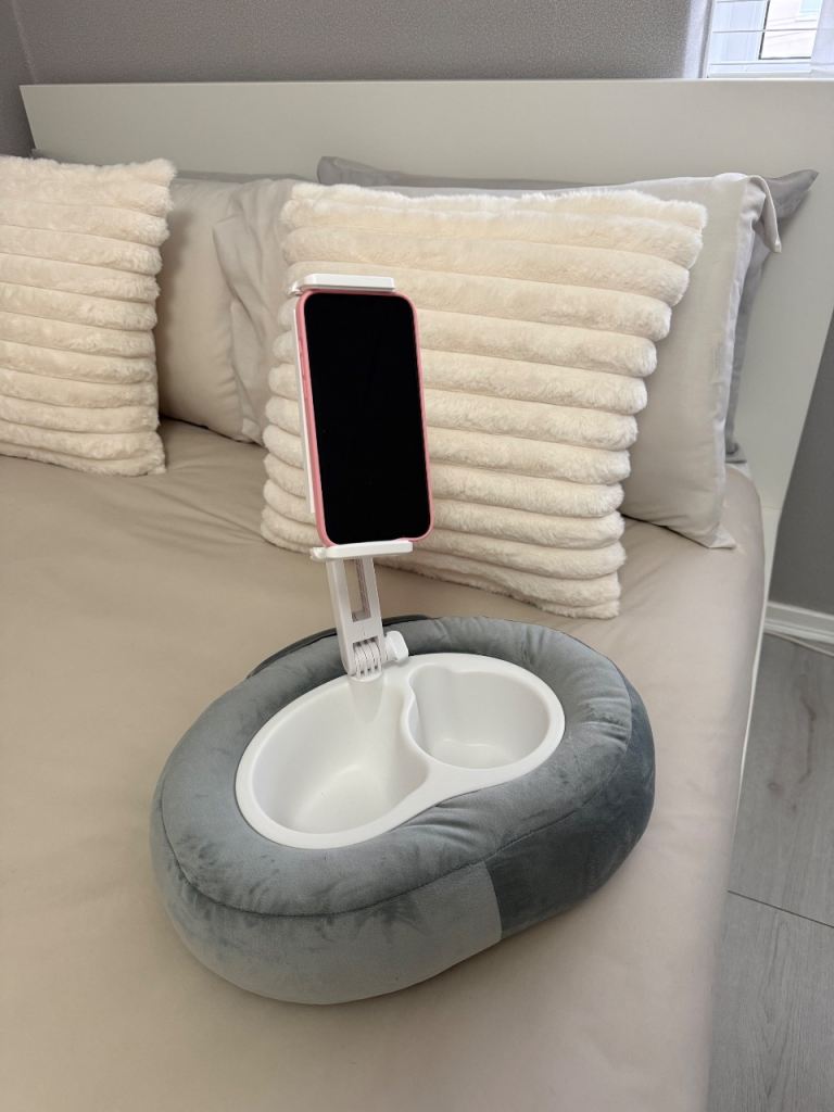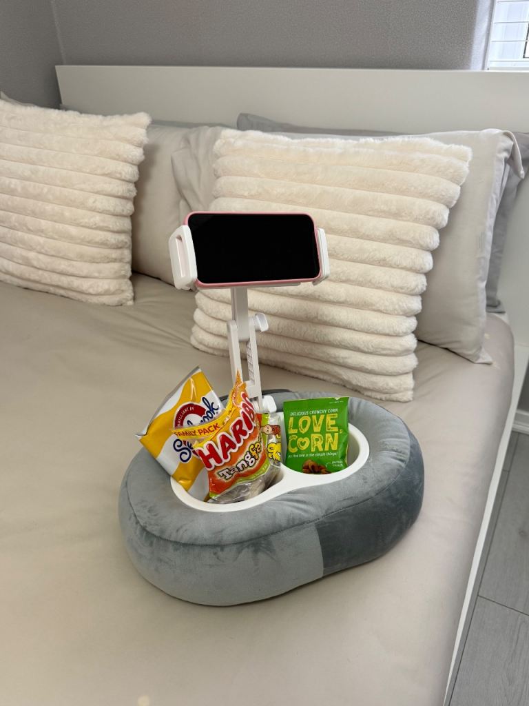this is brand new, never used, perfect for phone and iPads, flexible, in bed or on sofa, put your snacks in it, and can take out for washing