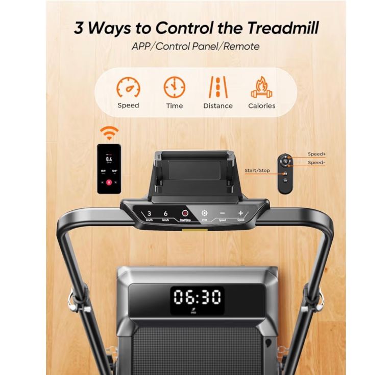 【LED Display, App Control & Silent Remote Operation】This portable treadmill features a multifunction LED display that shows speed, distance, time and calories in real time. Speed can be adjusted via the remote control or fitness App. The remote includes a silent function and quick speed buttons (3 km/h and 6 km/h), reducing adjustment time and allowing you to reach your desired speed instantly without distraction.