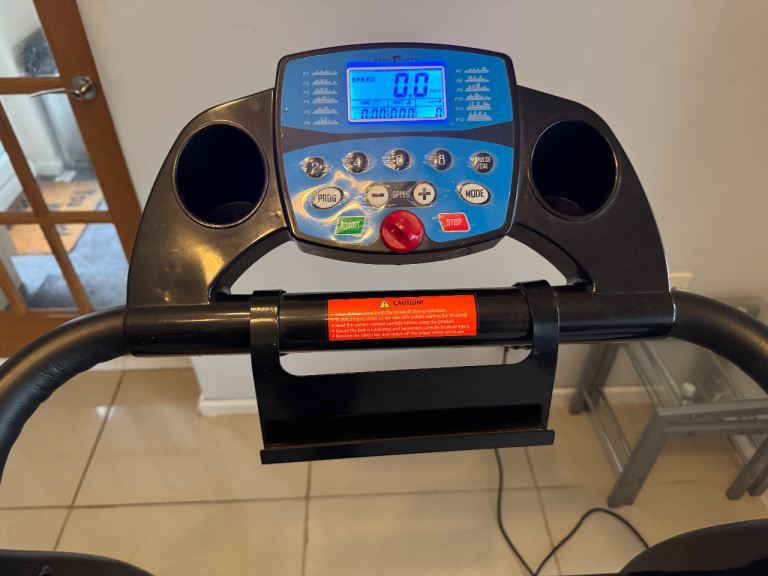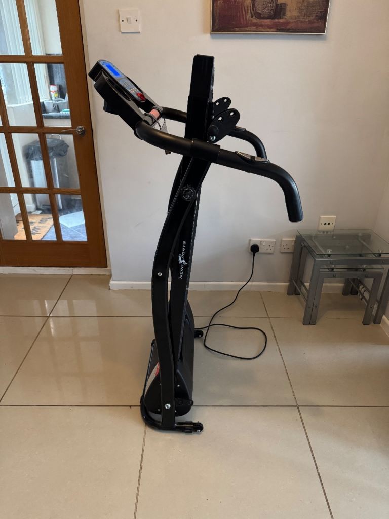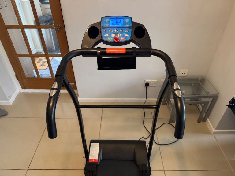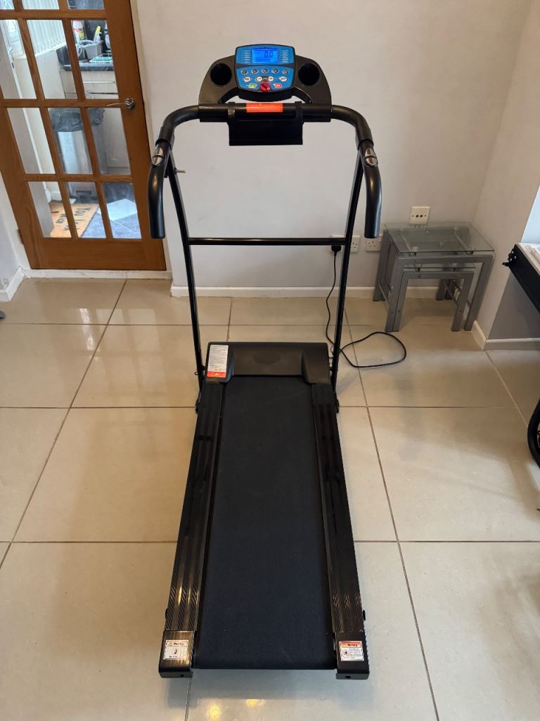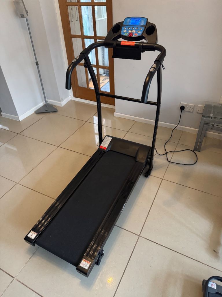 Fully working electric treadmill with big screen computer tells you all calories / speed / distance etc , got the emergency key to stop everything ,folds up / cup holders & on wheels to put away & adjustable incline