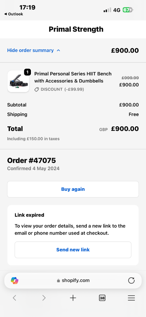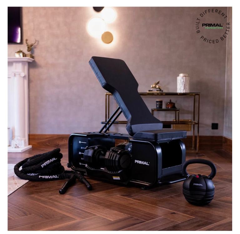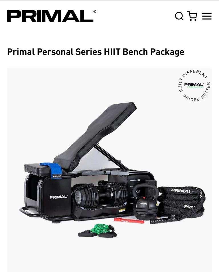 Primal Personal Series HIIT Bench with accessories and dumbbells, never used. Versatile, high-quality bench ideal for full-body workouts at home, combining strength and HIIT training in one compact setup. In brand-new condition and ready to go.