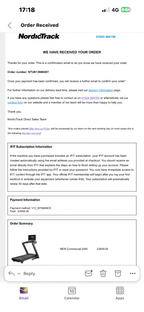 NordicTrack Commercial 2450 Folding Treadmill in excellent condition, only used 3 times. High-spec, smooth and powerful treadmill with a large running deck, incline/decline, and folding design for easy storage. Perfect for serious home training without the wear and tear of heavy use.