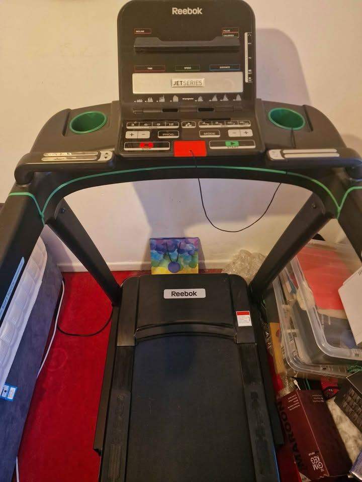 Reebok jet 200 treadmill. Redecorating my room (hence all the boxes!) and no longer have room for this treadmill. It's been used for probably a cumulative 10-15 hours. Great bit of kit - measures calories, heart rate, connects to bluetooth, goes up to 11mph and 15 incline settings. This treadmill is £800-£900 online. Some light cosmetic wear but all mechanics are perfect and even throwing in a near full bottle of the belt lubricant to go with it. Based in Tipton, West Midlands. £300 ono