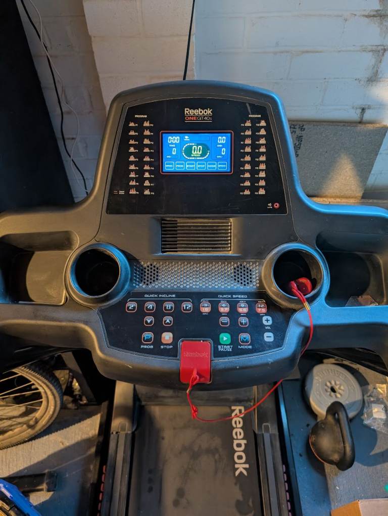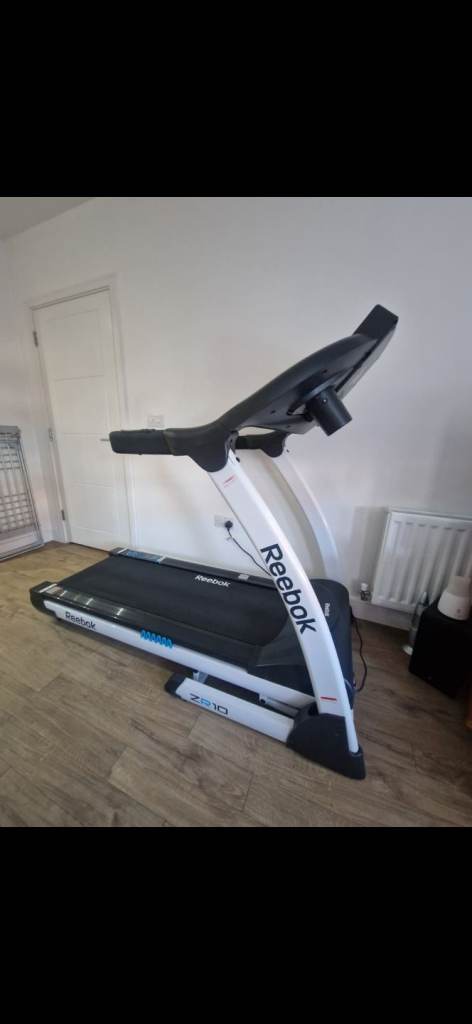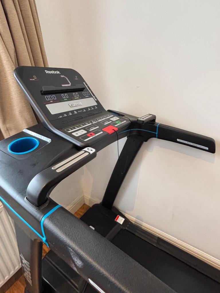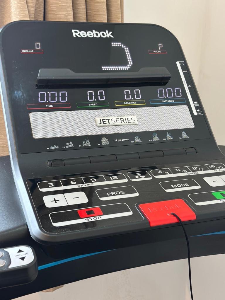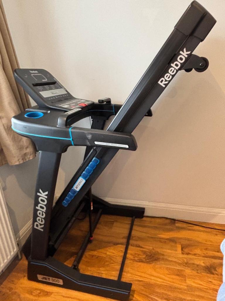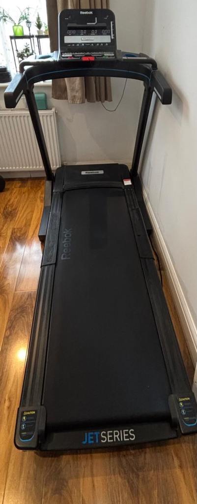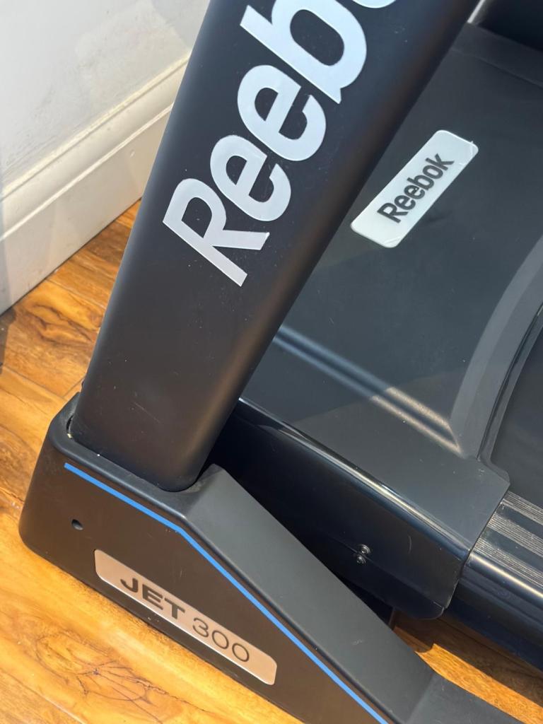 Reebok Jet 300 treadmill in fully working condition. A solid, high-quality machine with multiple speed and incline settings, built-in workout programs, and a foldable design for easy storage.