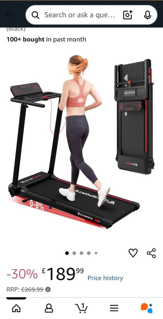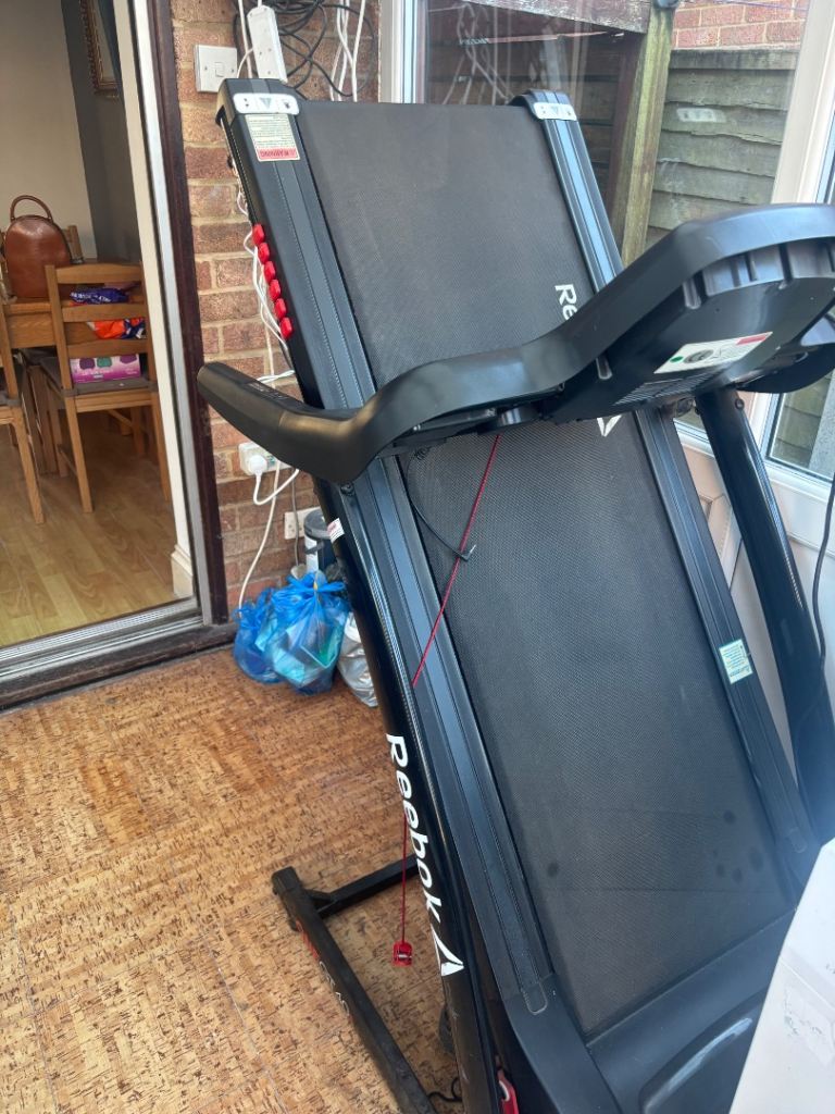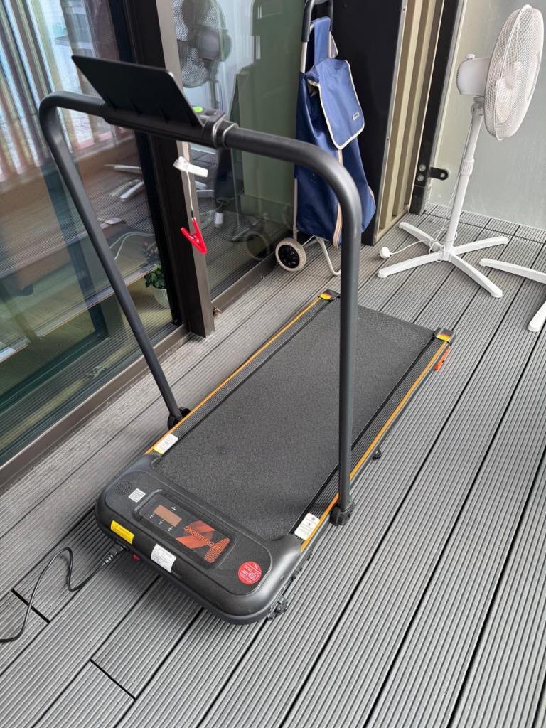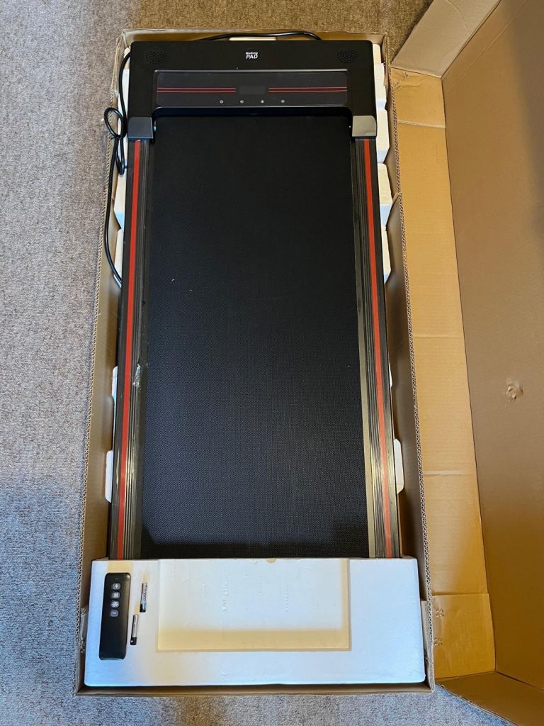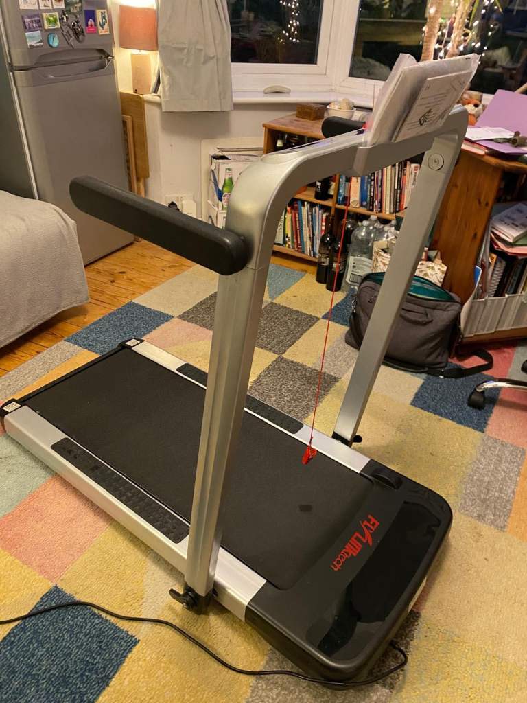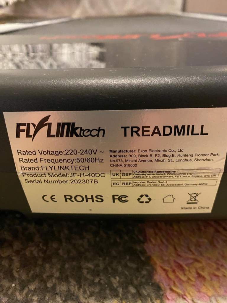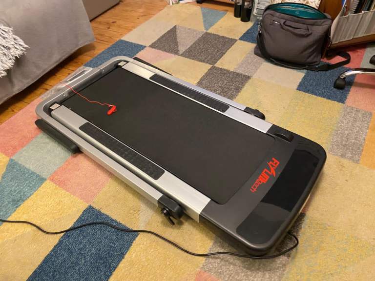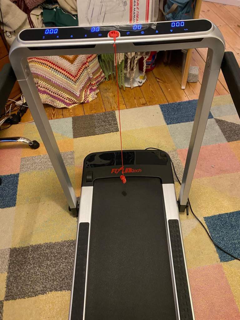 Good as new FlyLink Tech Treadmill. Can be used with or without bar so fits under a desk. Easy to store under bed or sofa. Can deliver for free in local area. Have all paperwork from original purchase. Have video of it working.