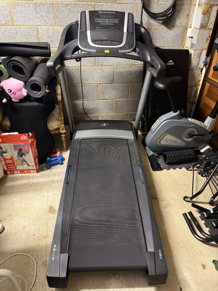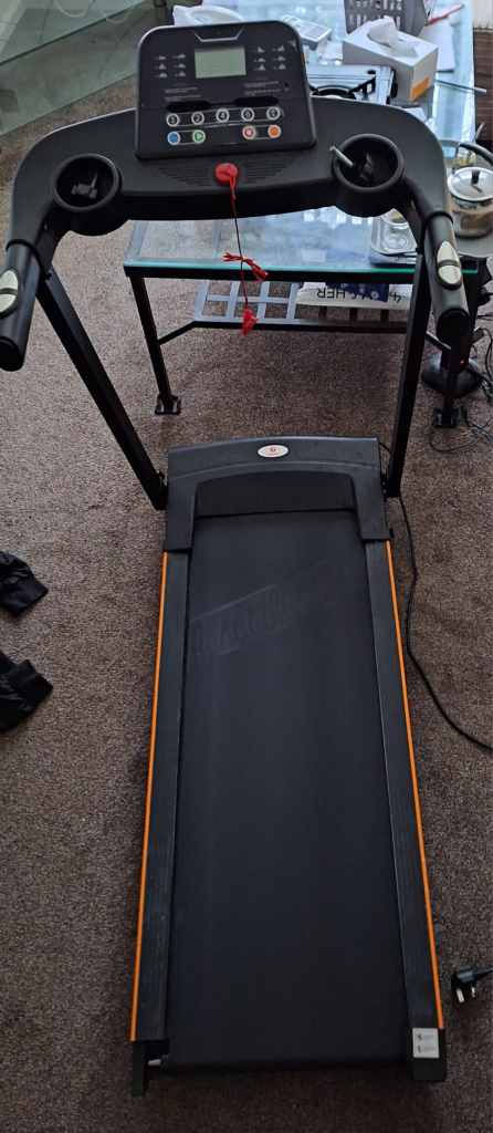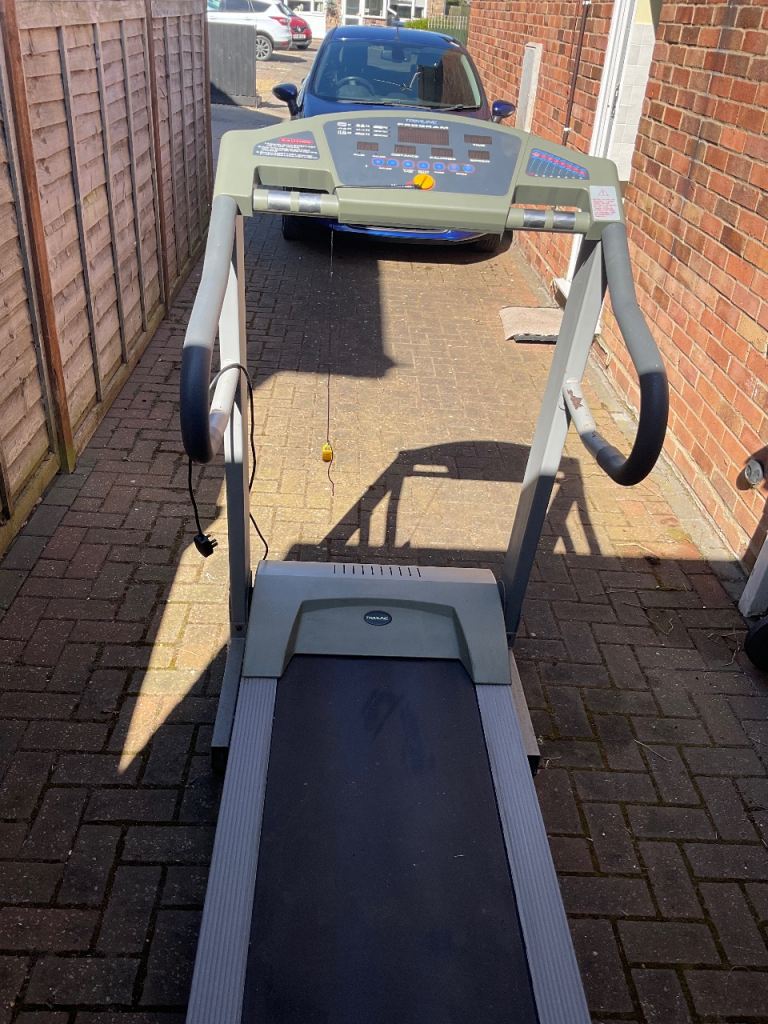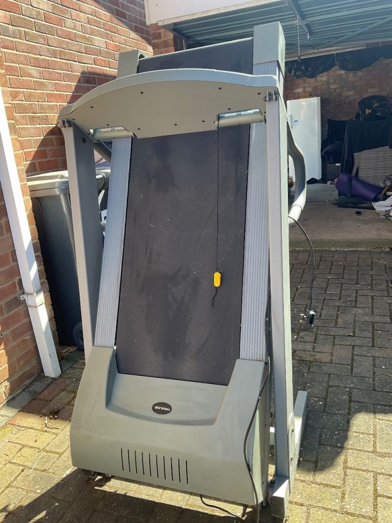 Running machine in good working order. 6 preset programs. 12% Incline option. Key operations include safety key insertion to power on with speed/incline controls managed via the 8x20 LED console.