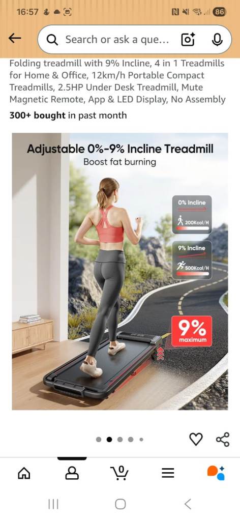 Tredmil has a 1-12 KMPH speed rage with an optional 9% incline.