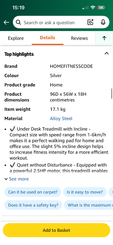 Walking treadmill with 5% incline. It is quiet and has the wheels for easier transportation - ideal for the office. I’ve hardly used it so it’s in great shape. Comes with remote. Collection from Canary Wharf