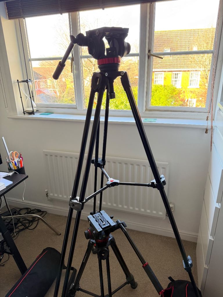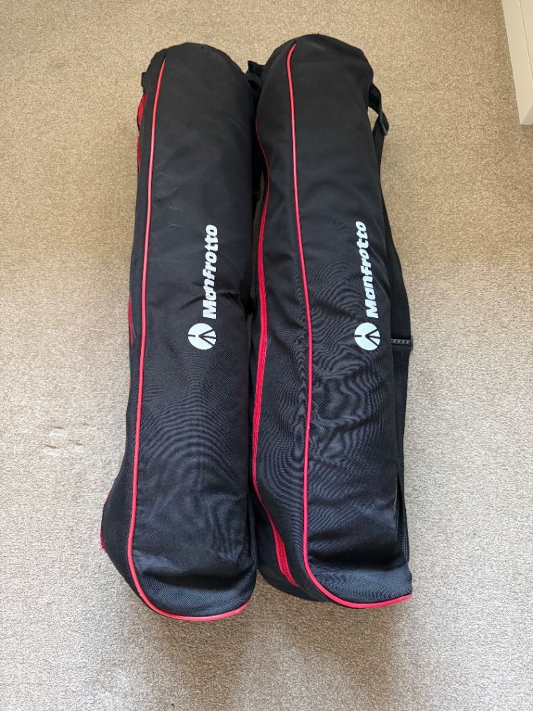 2 X Manfrotto Tripods complete with base plates and bags. Fully working in good condition with just a few light marks and scratches. Rarely used over the last few years and is still an incredible tripod.