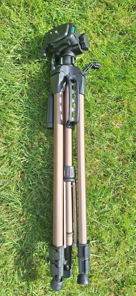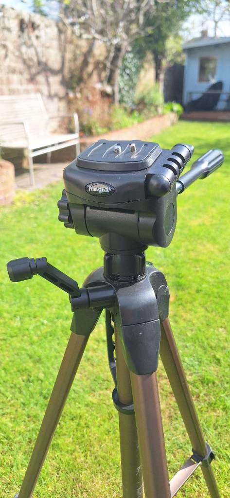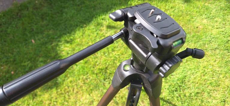3 way tripod head, quick release plate, crank, aluminium legs, rubber feet. 3 piece leg segments (2 fold extendable). Levelling device.
