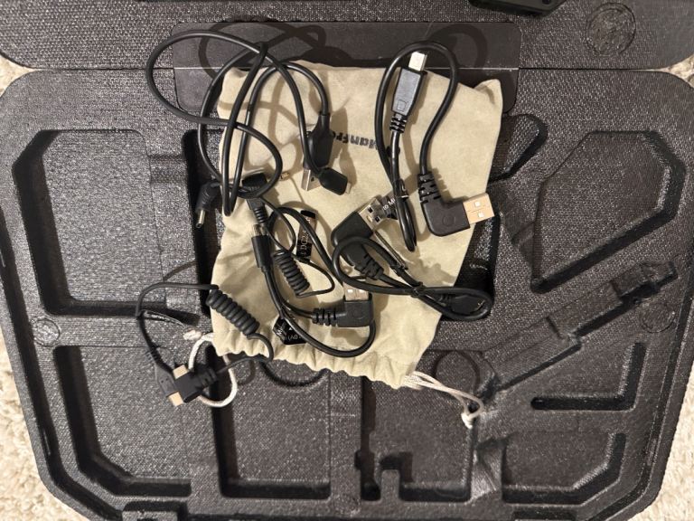 The bag inside contains all relevant cables that you will need as well as a bag of screws with Alan key, to attach the arm provided for extra points of contact when filming.