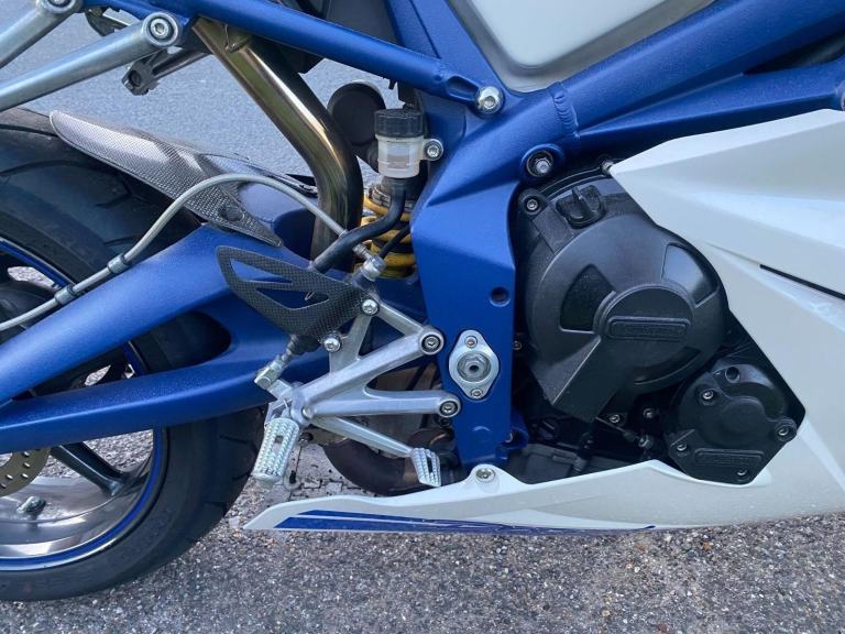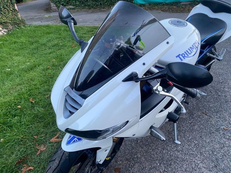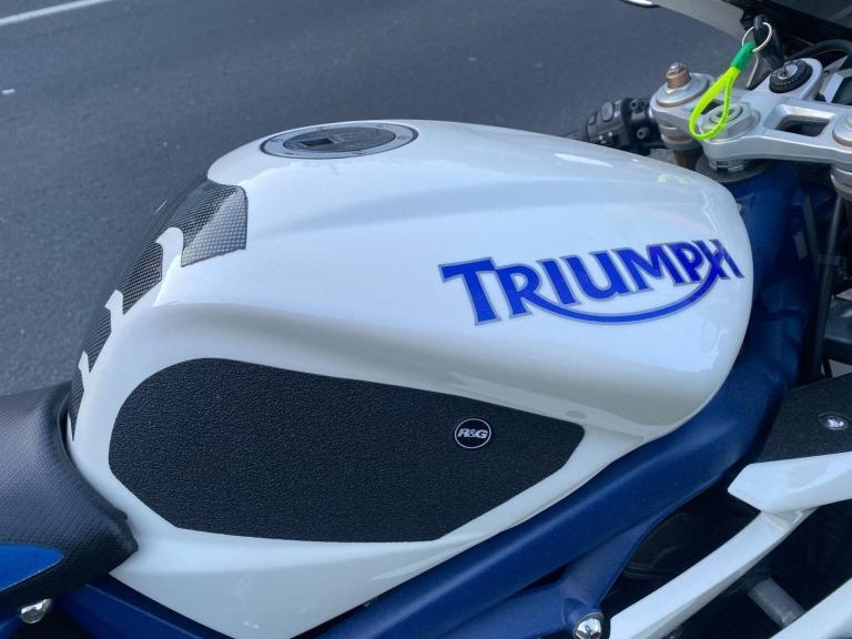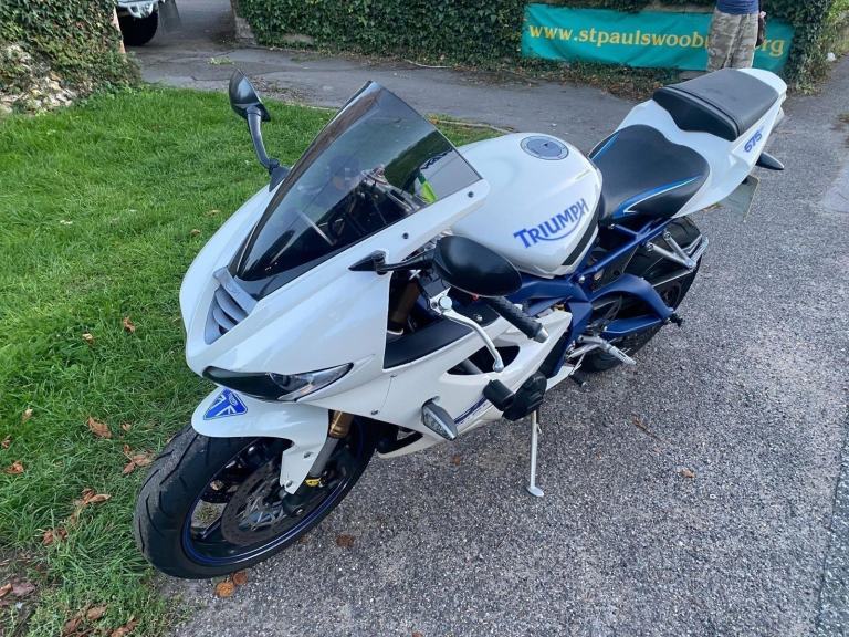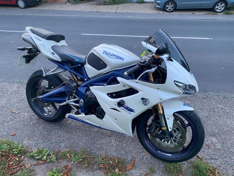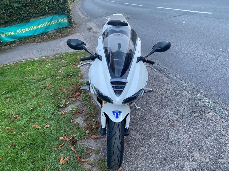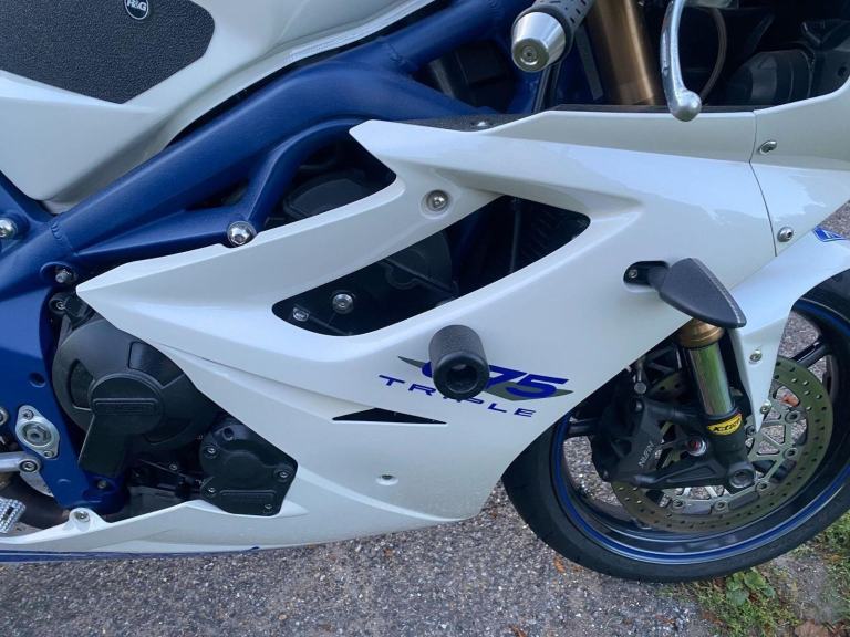 White, 2009 (09) Triumph Daytona 675 SE (ABS) Limited Edition in Pearl White with a striking Sparkle Blue frame that has covered 27577 miles.Fitted with an Arrow under-seat titanium end-can with a carbon tip that sounds superb.Also R and G tank grips-pads, carbon tank protector, R and G paddock stand bobbins, crash protector bungs, carbon hugger, carbon heel plates, GB Racing engine protectors and a tinted windscreen.The bike is in excellent condition and has been very well cared for.Recent new tyres fitted.Also 2 keys and a service record book with 9 dealer stamps which includes a valve clearance check at 25119 miles along with new spark plugs and air filter.Just serviced by us and ready to go.MOT until 18/5/2026Finance / Extended Warranties / Courier Delivery / Part-exchange are all available from WOOBURN GREEN MOTORCYCLES, 8 owners, , Courier Delivery / Finance / Part-Exchange and Extended Warranty are all available