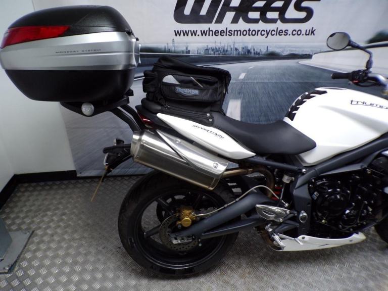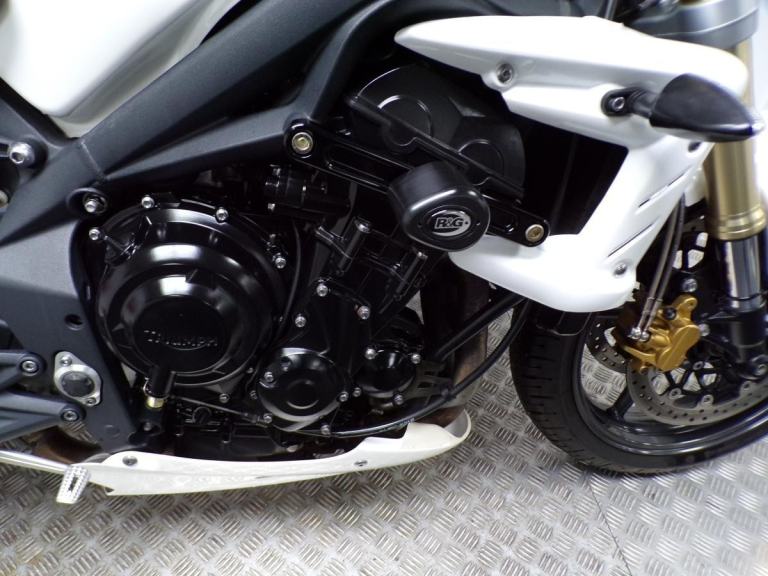 ENGINE: 675CC IN-LINE TRIPLE IS SMOOTH, TORQUEY, AND RESPONSIVE. THIS STUNNING EXAMPLE HAS A RADIATOR GUARD, TANK PAD AND CRASH PROTECTION, R & G RADIATOR GUARD, PADDOCK BOBBINS, TRIUMPH PILLION SEAT BAG, AND A GIVI TOP BOX. THERE IS A SET OF HEIGHT ADJUSTING BRACKETS IN THE TRIUMPH PACK, THE BIKE DOES SEEM TO SIT SLIGHTLY LOWER SO MAY I SUGGEST IT HAS BEEN LOWERED WITH THE ORIGINAL IN THE PACK, BUT PLEASE FEEL FREE TO COME HERE AND TRY IT FOR SIZE.