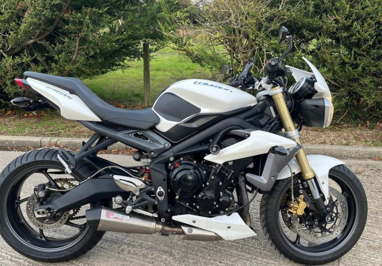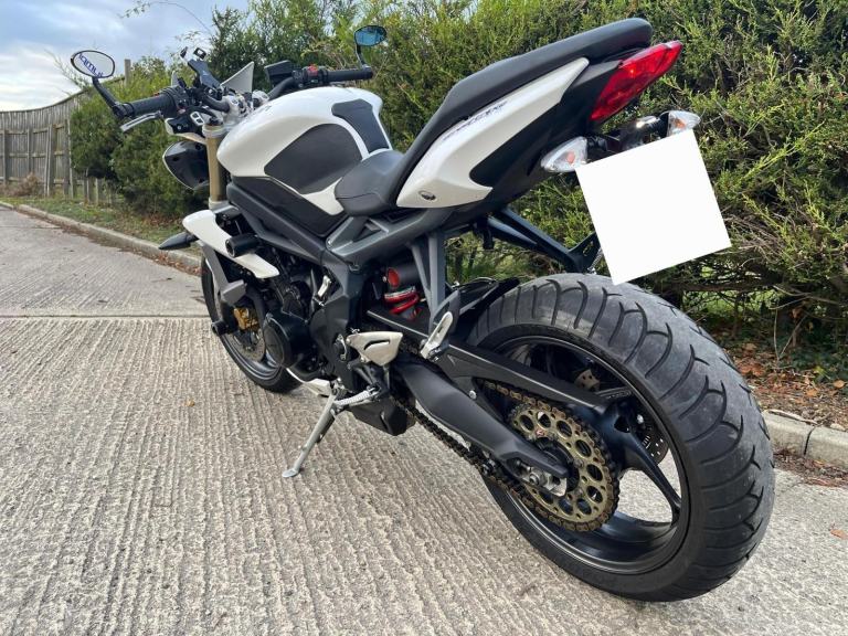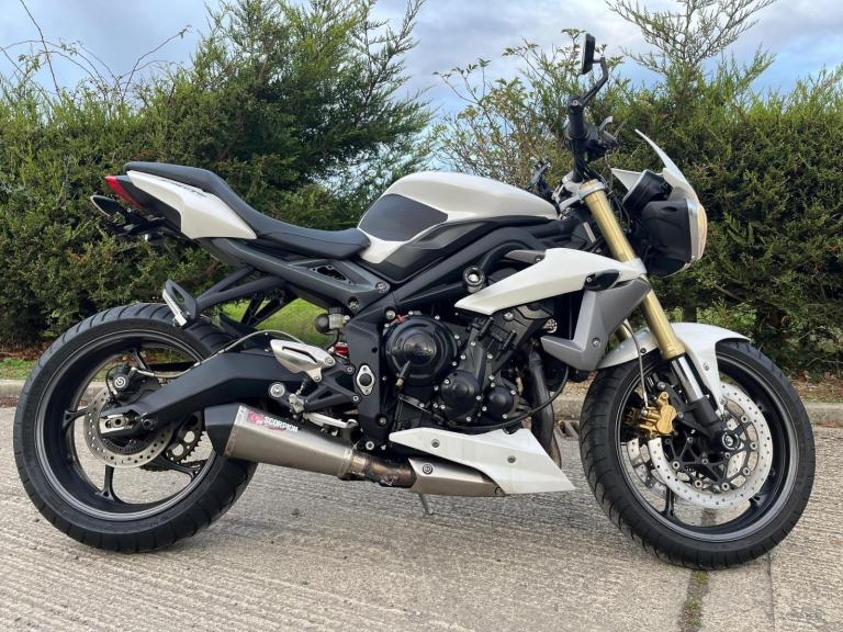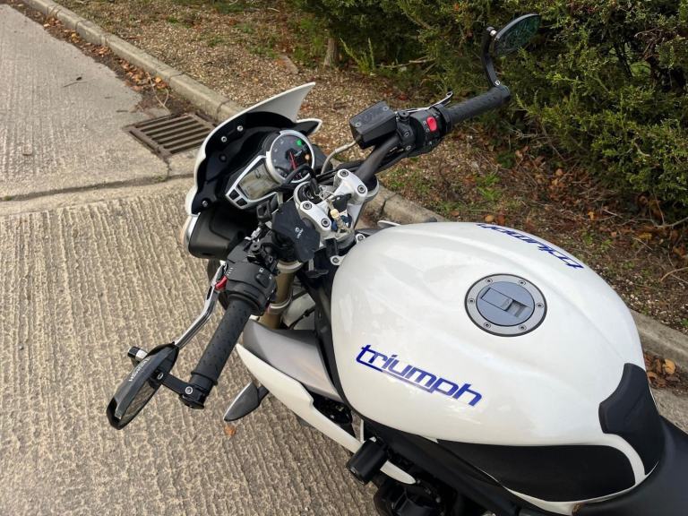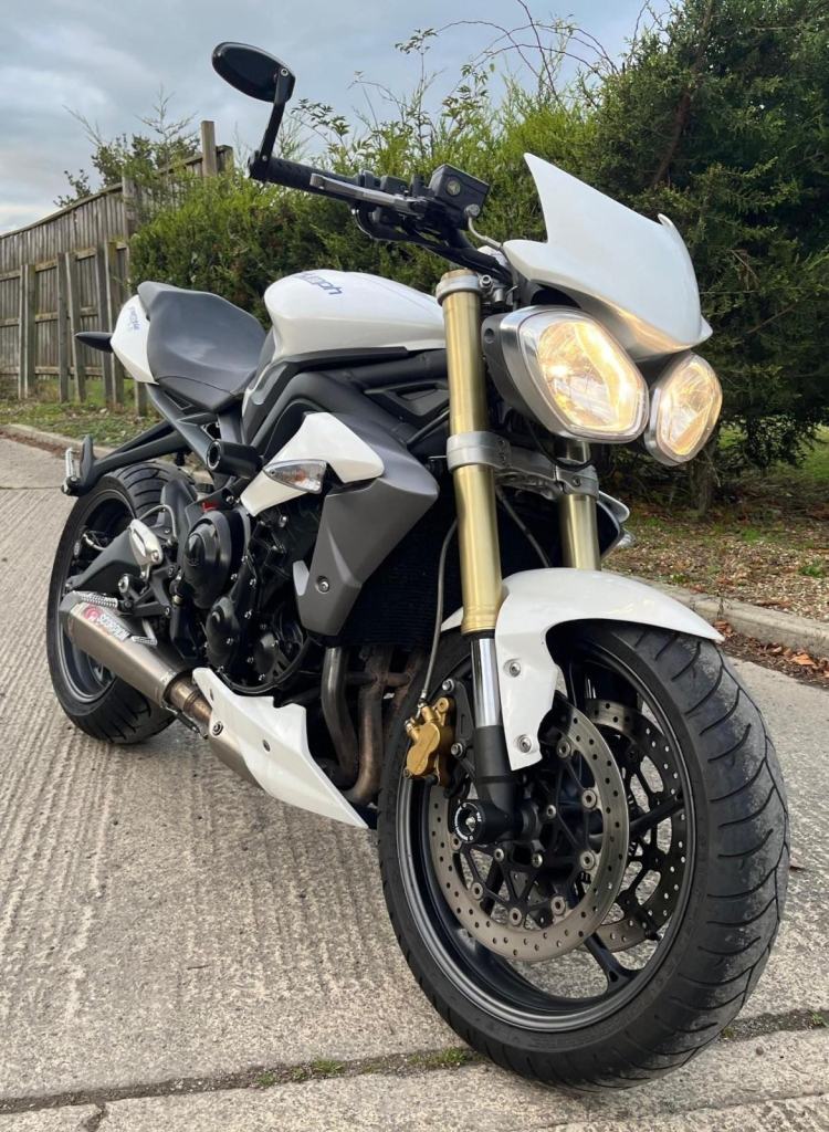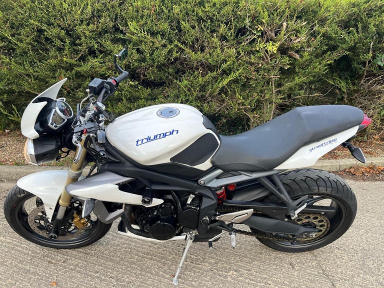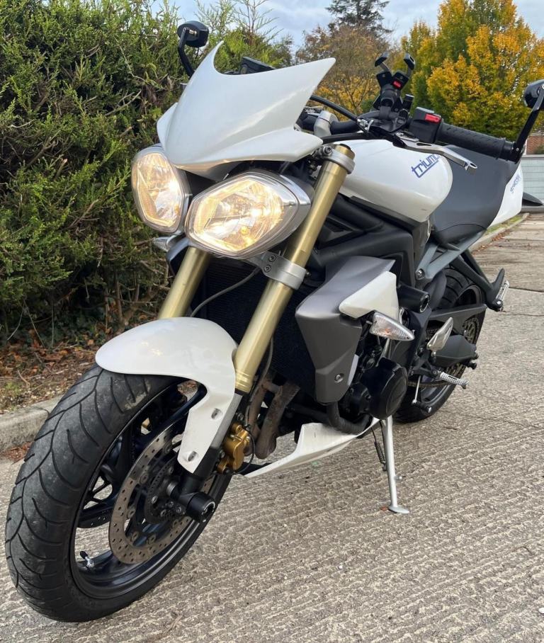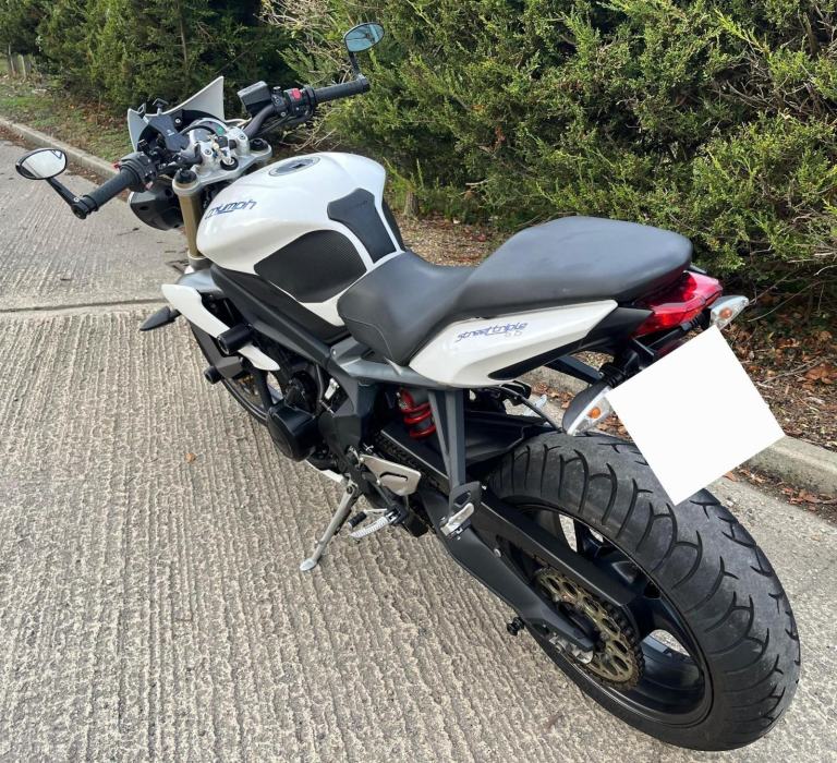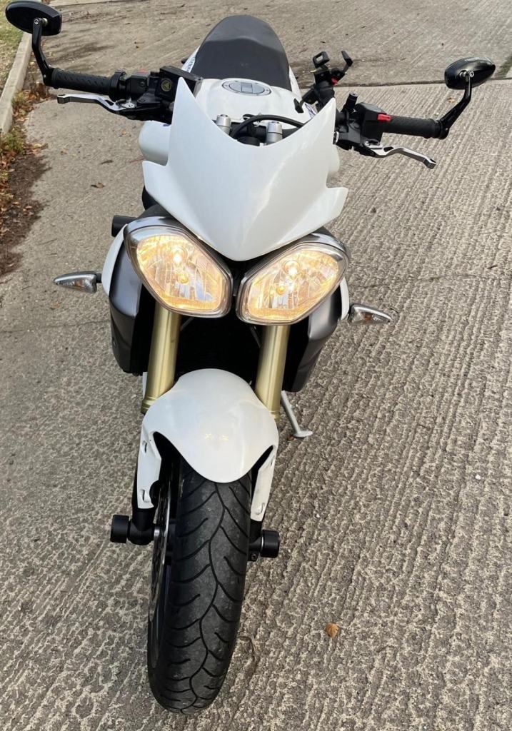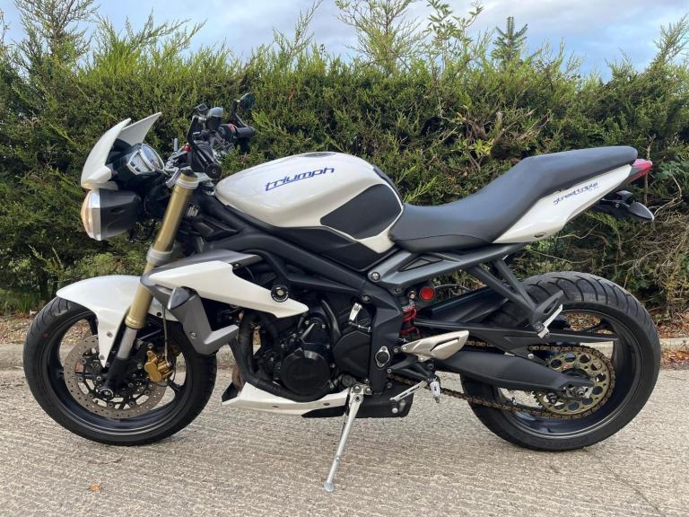 White Triumph Street Triple 675, year 2014 (14 reg.), 21,106 miles. PLEASE VISIT OUR WEBSITE DIRECTLY FOR THE FULL RANGE OF UP-TO-DATE STOCK WHICH MAY NOT BE ON OTHER PLATFORMS. VIEWING STRICTLY BY APPOINTMENT ONLY. Visit [Website URL removed] call 01759 591666 or email [Email address removed. Click Email button to contact us.] for more details.