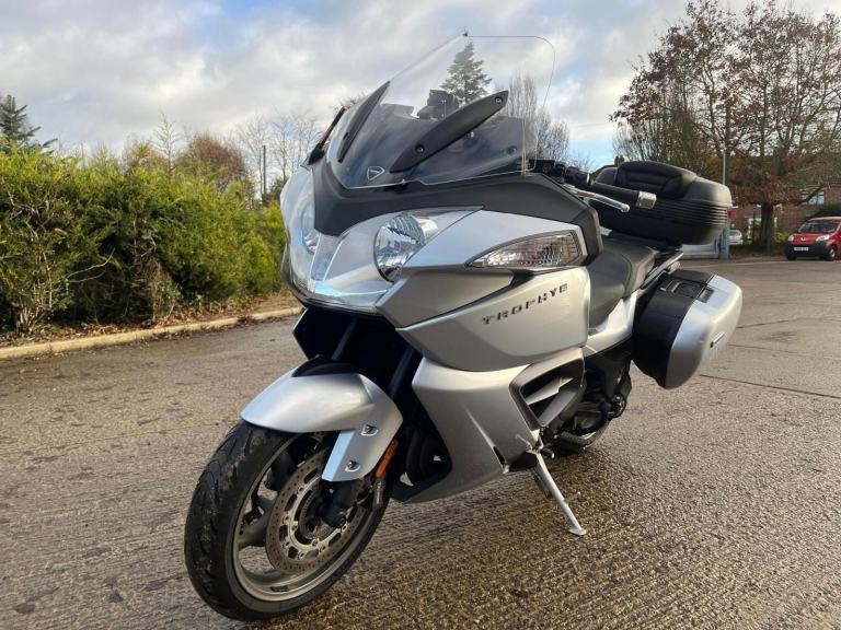 Silver Triumph Trophy 1200, year 2014 (64 reg.), 31,064 miles and 2 previous owners. MOT included in the price. PLEASE VISIT OUR WEBSITE DIRECTLY FOR THE FULL RANGE OF UP-TO-DATE STOCK WHICH MAY NOT BE ON OTHER PLATFORMS. VIEWING STRICTLY BY APPOINTMENT ONLY. Visit [Website URL removed] call 01759 591666 or email [Email address removed. Click Email button to contact us.] for more details.