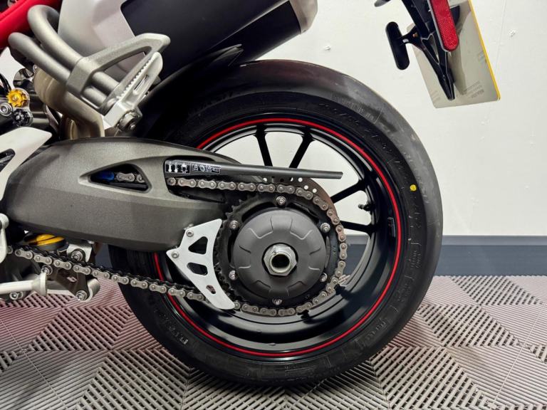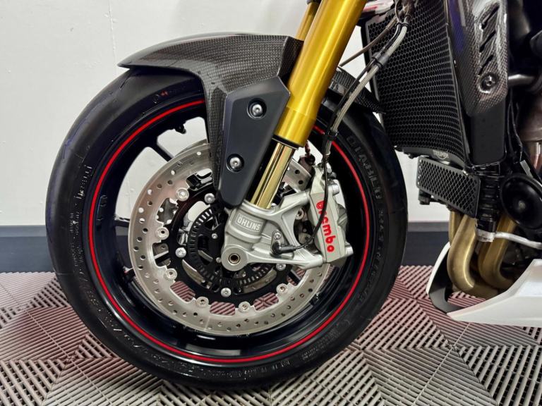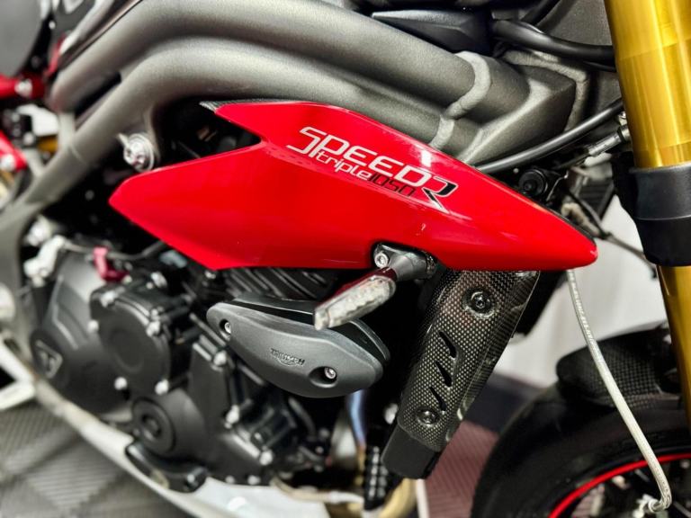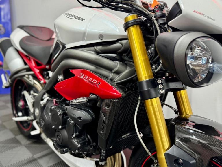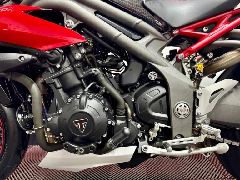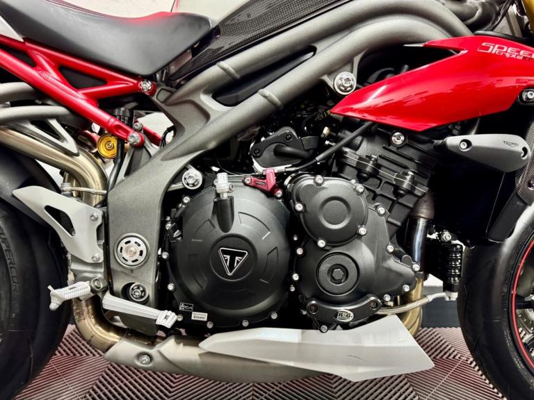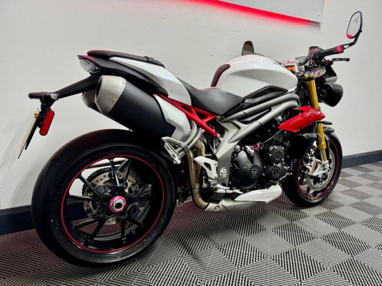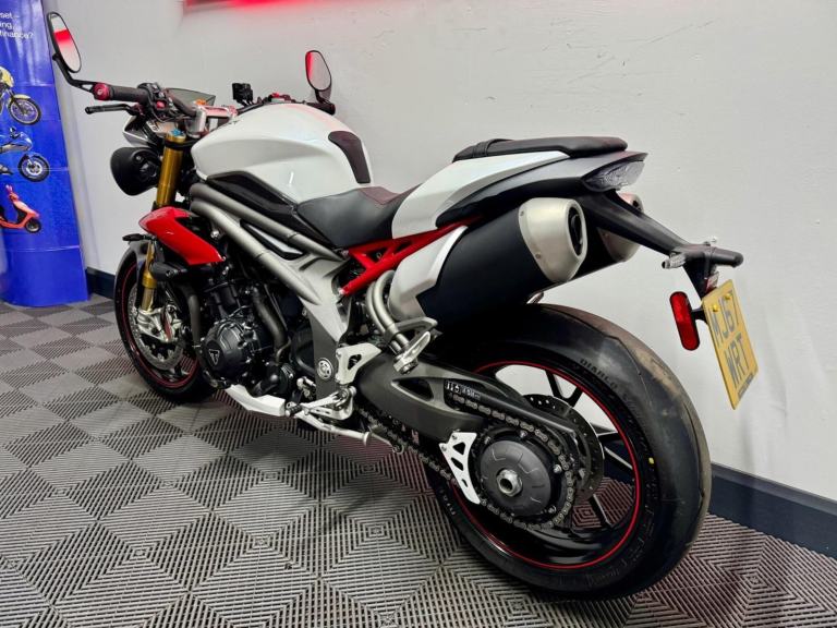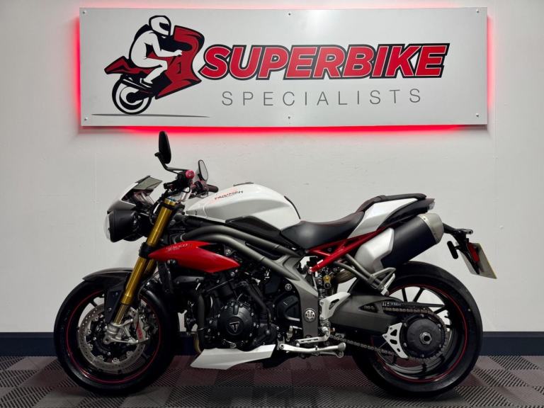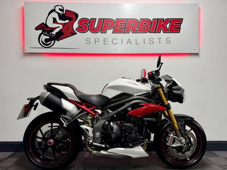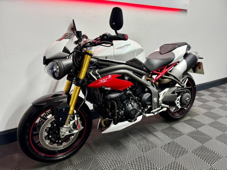 White, The 2018 Triumph Speed Triple 1050 R centers on that signature 1050cc inline triple?now with ride-by-wire and a freer-flowing exhaust?that dishes out 138 bhp and a hefty 83 ft-lb of torque boosted right through the range. It hits hard from low revs for instant, urgent drive in real-world scenarios like overtakes or pulling away from lights, then keeps building smoothly and eagerly to the top, all with that raw, mechanical triple roar that's loud and addictive without being obnoxious.The Öhlins setup (43mm NIX30 forks up front, TTX36 rear shock) makes it feel planted and precise?firm enough for sharp cornering and composed at speed, yet compliant when you dial it in properly. The chassis geometry and narrower tank let you sit more forward, sharpening steering response and making it feel more agile than the naked weight (219 kg wet) suggests, especially on twisty roads where it carves with confidence and security.Riding it day-to-day is straightforward: 825 mm seat height keeps feet planted for most, the slightly forward-leaning posture wraps around you nicely for control, and it's genuinely comfortable for 2-3 hour stints without needing constant breaks?many owners rack up big miles feeling fresh. Mirrors stay usable, vibes are minimal, and it behaves civilly in traffic or on commutes before unleashing when you [Website URL removed] looks the part with premium touches everywhere?carbon fibre bits, gold Öhlins, billet accents, alcantara, gorgeous paint, and varied finishes that scream high-end special rather than mass production. The det|| At Superbike Specialists, we offer a top selection of HPI-clear used motorcycles (unless stated). Our bikes are mechanically prepared by passionate onsite mechanics, with a focus on exceptional customer service. Every bike includes a 30-day warranty, with options to extend to 6 or 12 months, a minimum of 6 months MOT, and a fresh service. UK mainland delivery starts at £50. Competitive finance and card payments are accepted. We are also an authorised Scorpion Datatool dealer, offering fully fitted S5 Thatcham-approved trackers from £299. ||, 2 owners,