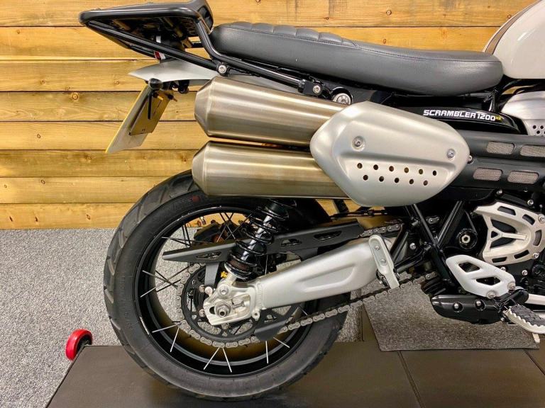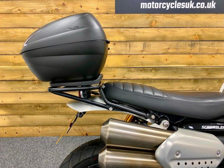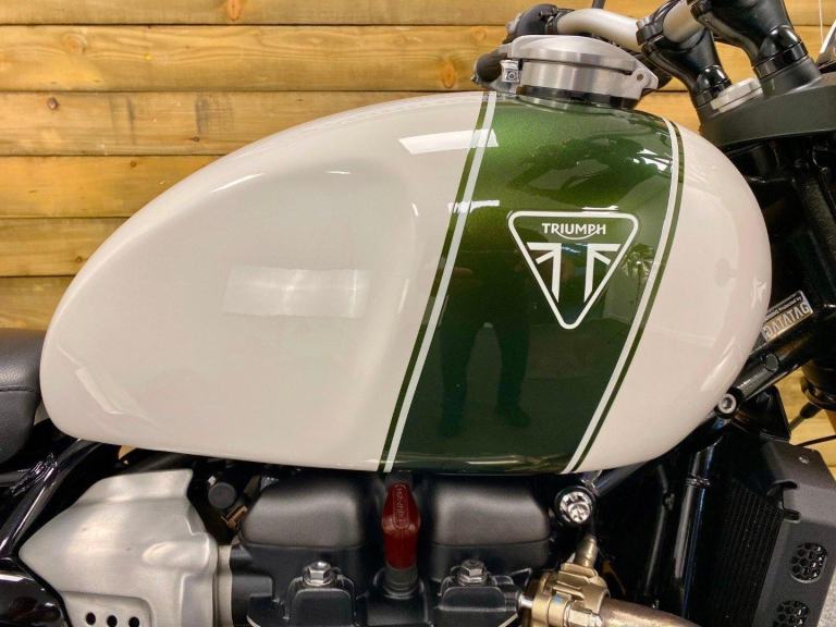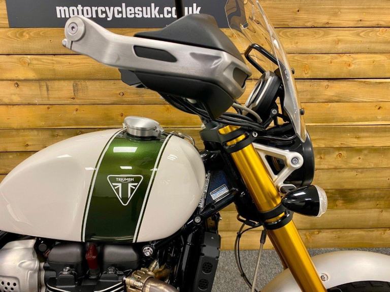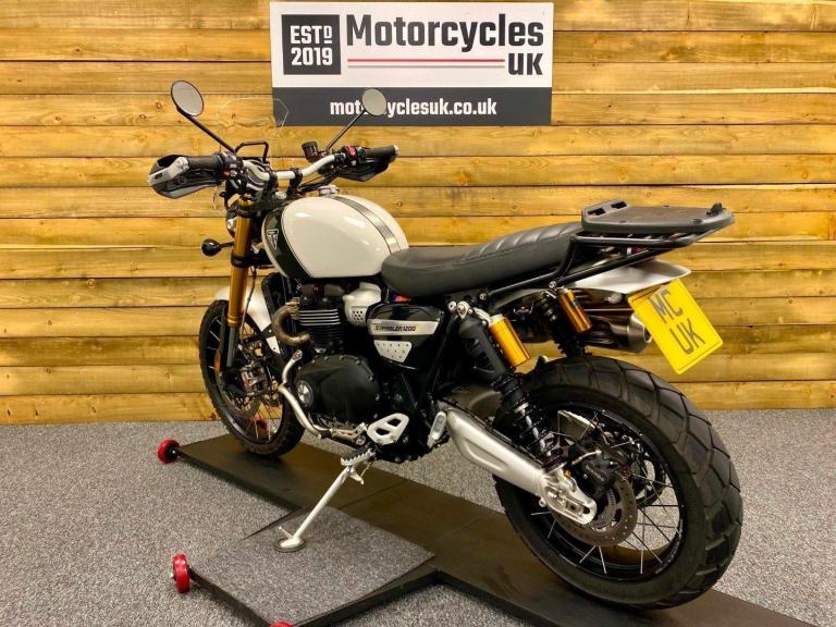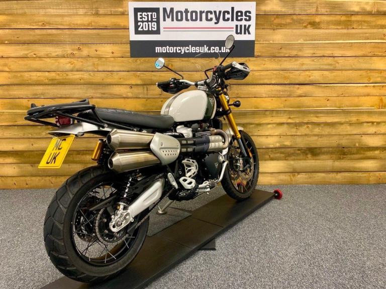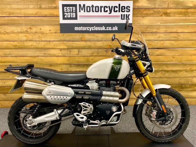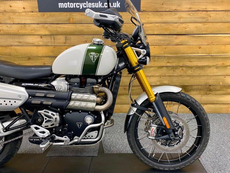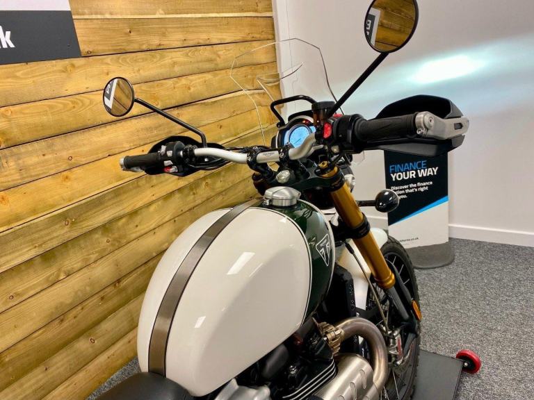 Triumph Scrambler 1200 XE, 2022, 22 Plate, Only 2,599 Miles, 2 Owners from New with Full service history and in Superb condition. The Scrambler 1200 XE is renowned for it's Superb retro styling, Adventure touring capabilities while being best in class for genuine off road capability and specification including; Brembo M50 brakes with optimised cornering switchable ABS, Fully adjustable twin Öhlins rear shocks, Showa forks, Side laced spoke wheels, 6 Switchable riding modes including off road pro for extreme off road riding, Traction control, Triumph heated grips, LED lights, Cruise control, Colour TFT Dash with Bluetooth connectivity, Illuminated switch-gear, Key-less ignition, Givi Top box, Engine bars, Touring screen, Evotech radiator guard, Bash plate, Hand guards and a USB charger. Finished in the stunning Fusion white and Brooklands green colour combination. If you want a bike that really can do it all then look no further, call today!