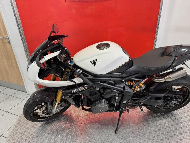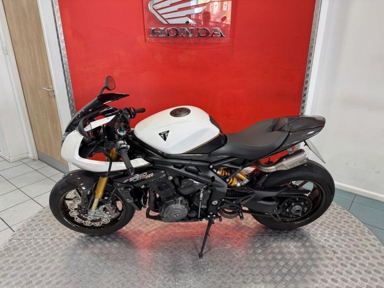 The 2023 Triumph Speed Triple 1200 RR is a high-performance cafÉ-style roadster that blends a muscular 1,160 cc inline three-cylinder engine tuned to produce around 180 PS (177 hp) and 125 Nm of torque at 9,000 rpm with premium Öhlins Smart EC 2.0 electronically adjustable semi-active suspension front and rear, delivering superb control and ride quality in diverse conditions.