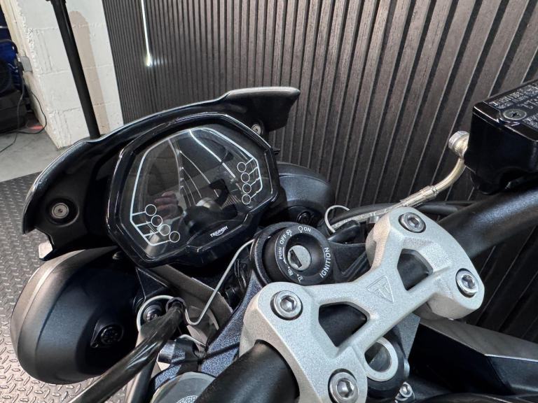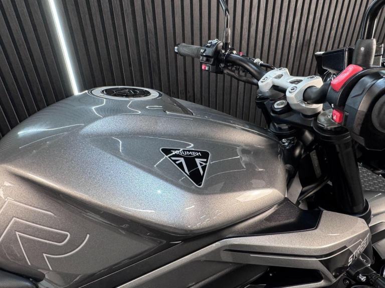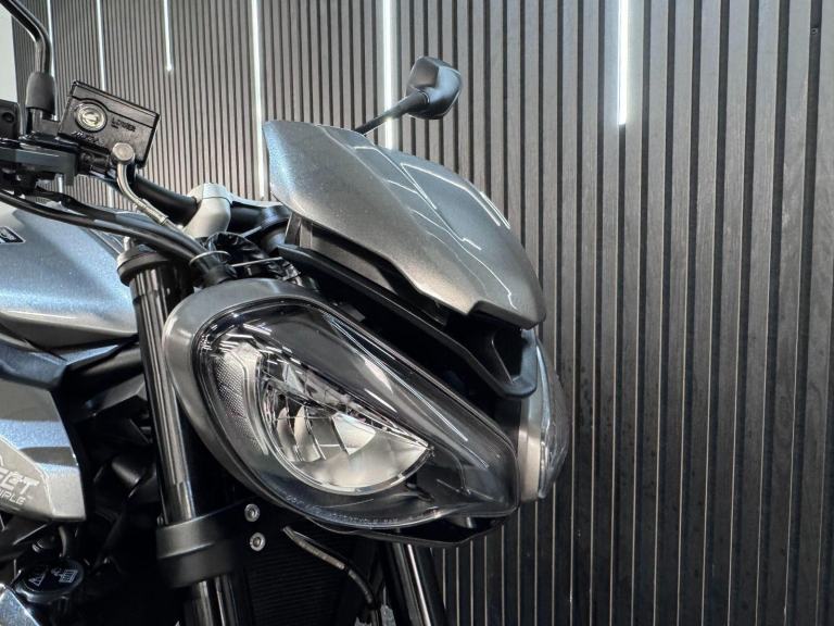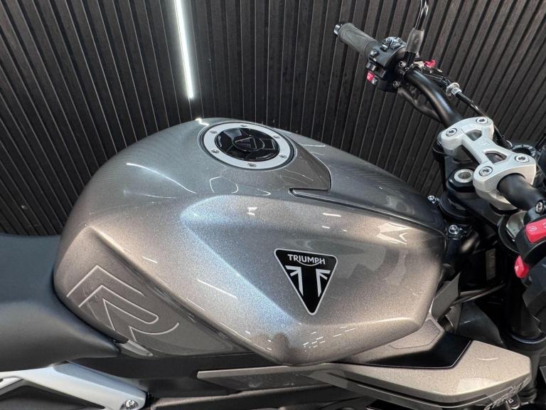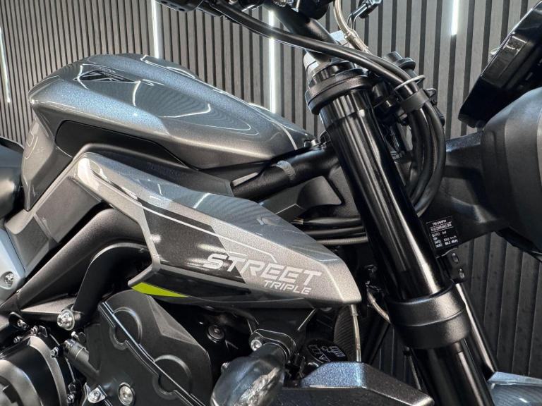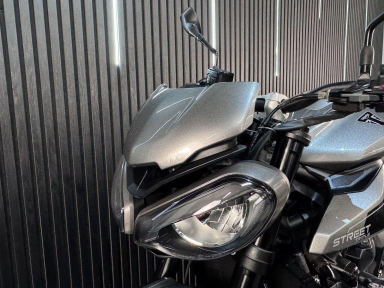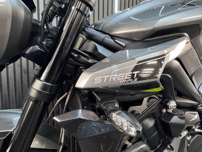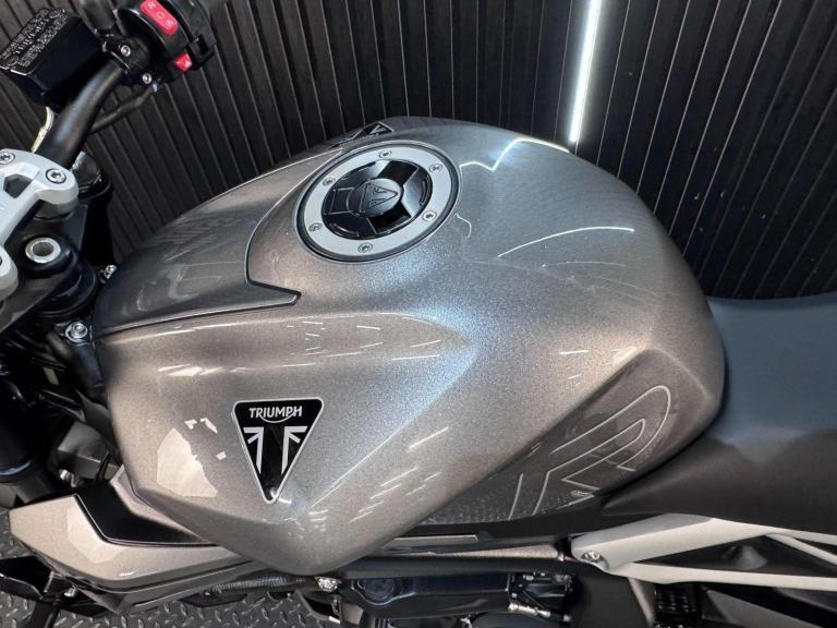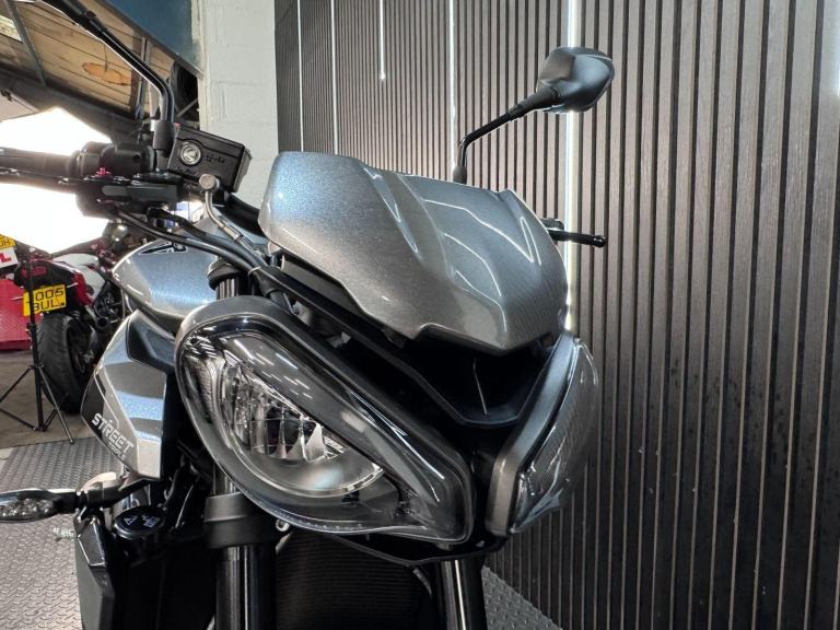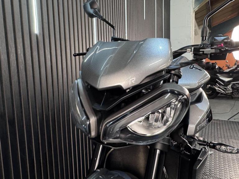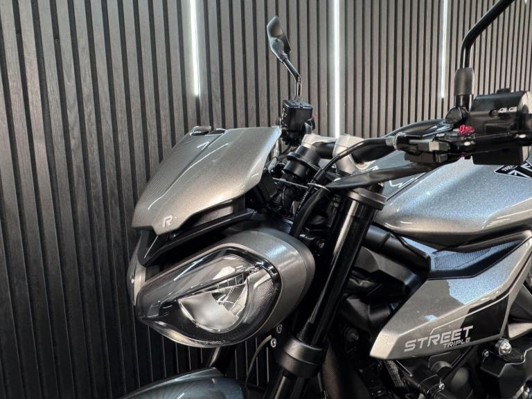 Silver, 24/7 ONLINE PURCHASE AVAILABLE - This 2023 Triumph Street Triple 765 R is the latest, most advanced evolution of the world?s most acclaimed middleweight naked bike, finished in a sleek and modern Silver Ice. With a remarkably low 3,070 miles on the clock, this bike is in good overall condition and has been professionally prepared for its next owner with a comprehensive general inspection, a new oil filter, and a fresh oil change. It comes complete with two original keys and features a high-performance X-ring chain, ensuring smooth power delivery and maximum durability for its high-torque triple engine. The 2023 ''765'' generation received significant factory upgrades, making it the most powerful and technologically advanced Street Triple R to date. It is powered by a 765cc three-cylinder engine derived directly from Triumph?s Moto2? racing development, which for this model year saw a boost in torque and responsiveness. The engine is famous for its unique ''triple'' character?offering the perfect blend of low-down grunt and a screaming top-end rush, all delivered with an intoxicating intake howl that is unique to the British marque. As a Euro 5 compliant machine, this 765 R is packed with high-end rider technology, including a sophisticated six-axis IMU that governs Cornering ABS and switchable Optimised Cornering Traction Control.***Rest assured, your new bike includes a 3-month warranty (extension options available) and is guaranteed to have at least 6 months remaining on the MOT. Making your purchase simple: Explore our flexible finance plans and benefit from our affordable nationwide delivery service. Important Note on Viewing: Stock moves quickly! If you are planning to view a particular model, we kindly ask that you call us first to confirm its availability and avoid any disappointment***, 1 owners, 2 keys, ABS, Electric start, Rear Hugger, Stainless Exhaust, Please visit our website to buy online, apply for finance or find out about our delivery prices.