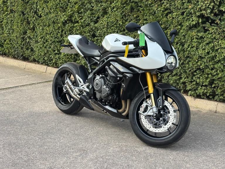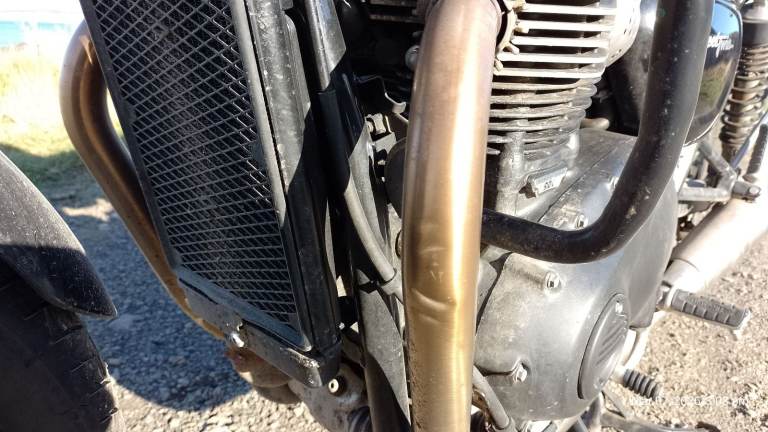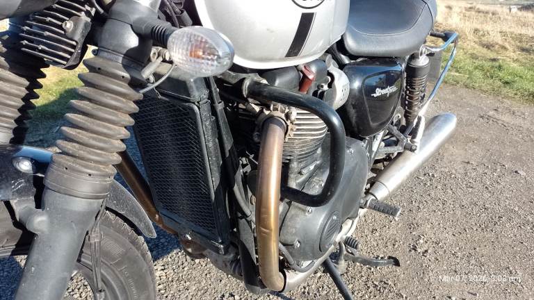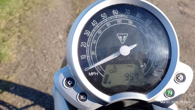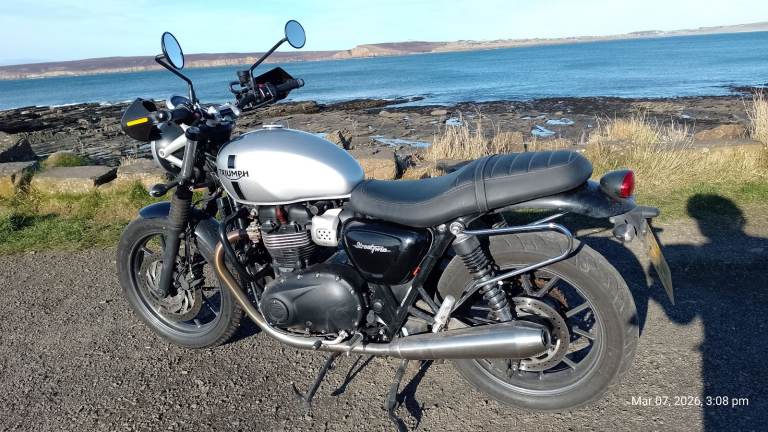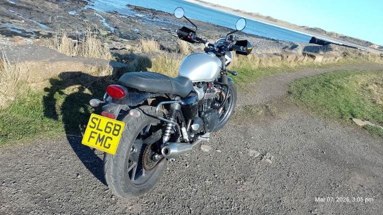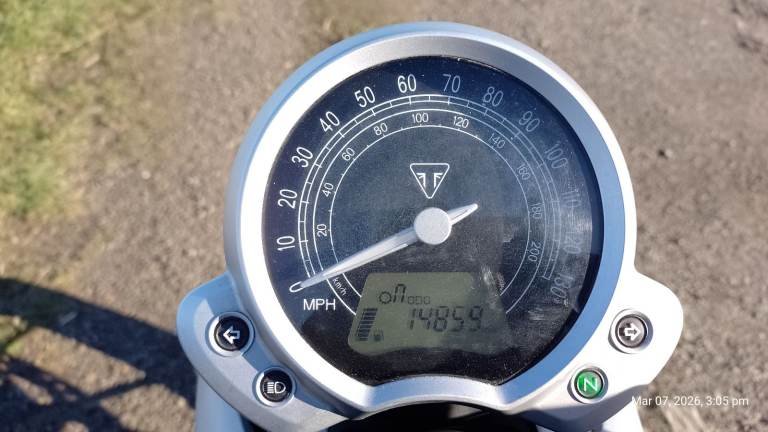 Owned by me for 2 years. I rode it a lot in year 1 but then bought another bike and it stayed in the garage. Got it MOT'd last October and replacement coil packs fitted. Then it was winter. taxed for March and have had a few salt free rides and it runs fine, now remember why I bought it! Anyway, the other bike is more comfortable for my ageing bones, so Triumph now for sale. Not a show queen as you can see and note shed type dents in nearside exhaust downpipe. Has center stand, crash bars, soft pannier guards and (by me) bodged on hand guards, (easily removed and looks better without them). It may get washed and mileage may rise a little. The other picture of speedo is the average fuel consumption.Please note Bike is in Thurso. I can assist with transport for costs. I may consider p/x for Morris Minor or similar classic car.