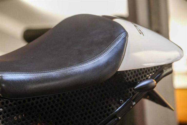 We are pleased to introduce this Triumph Daytona "Cafe Racer" for sale. Our example started its life as a Daytona T595 and then Marling Motorcycles waved their magic wand over the bike and produced the creation we see before us today. The bike had a full strip down and had the upgraded 955i engine fitted, • Café racer nosecone fairing and upgraded headlamp, 2014 speed triple swing arm and rear wheel fitted, Single seat conversion, shortened subframe, Bespoke subframe side panels, Wavy discs front and back, Brembo brake components, Speedo conversion, taken from Triumph Scrambler, Temperature gauge set into tank cowl, Custom paint job black/cream, Powder Coated cream wheels, Bar end mirrors, Wilbers rear shock.