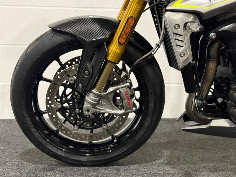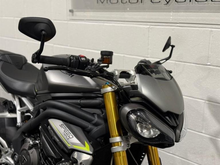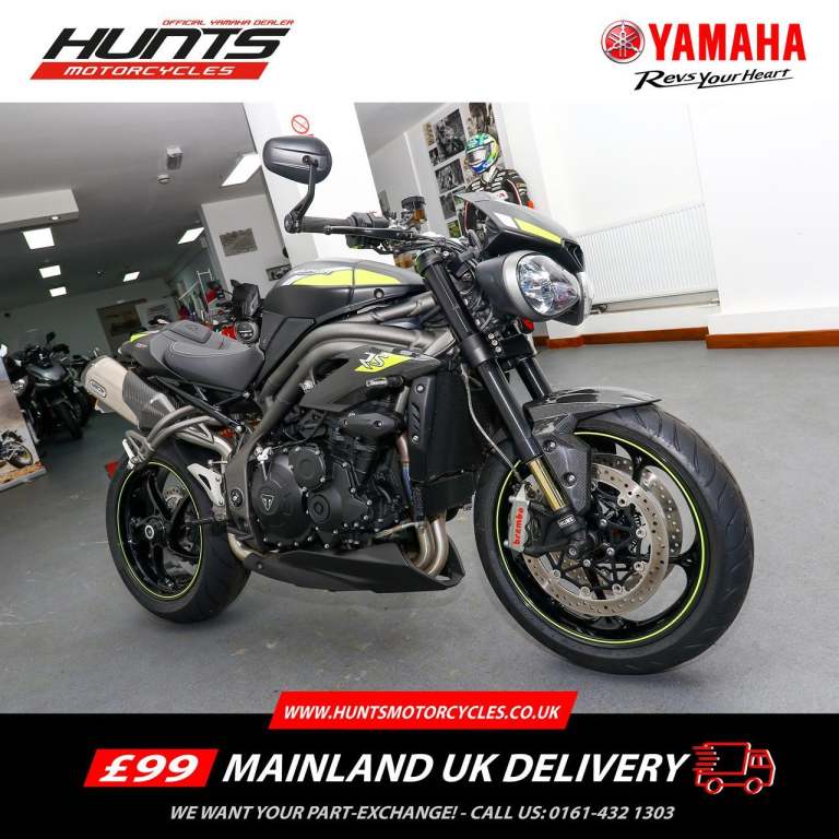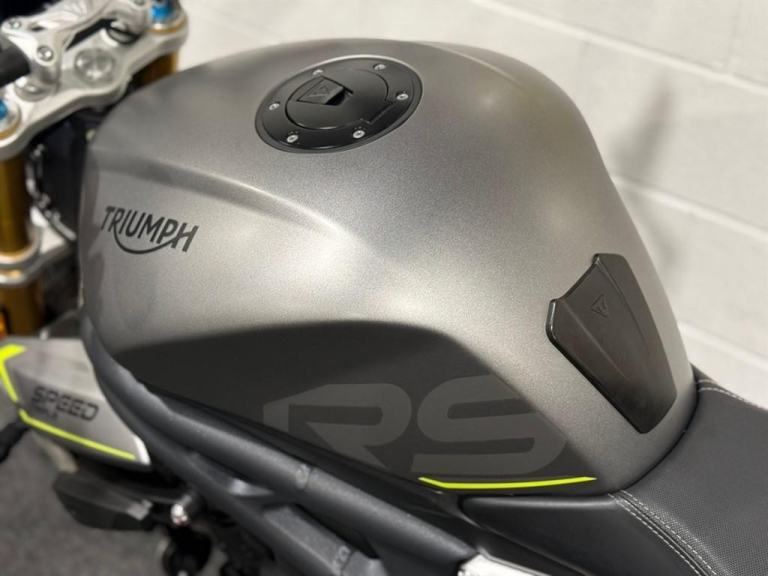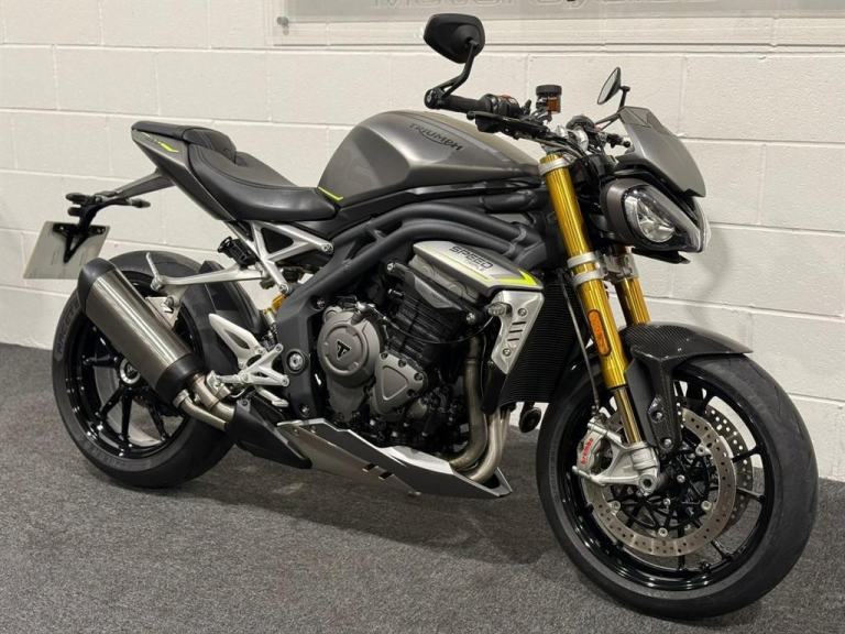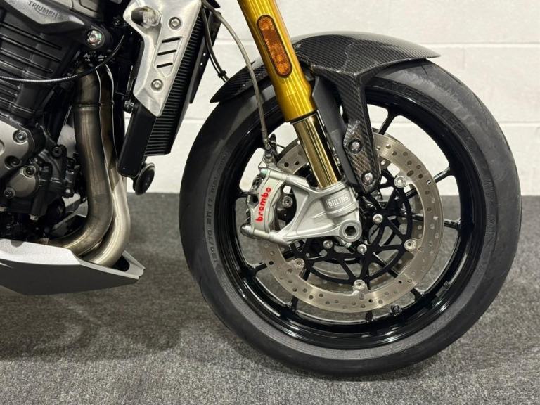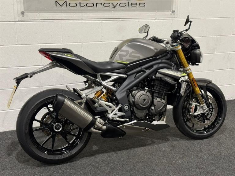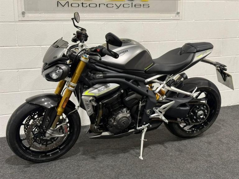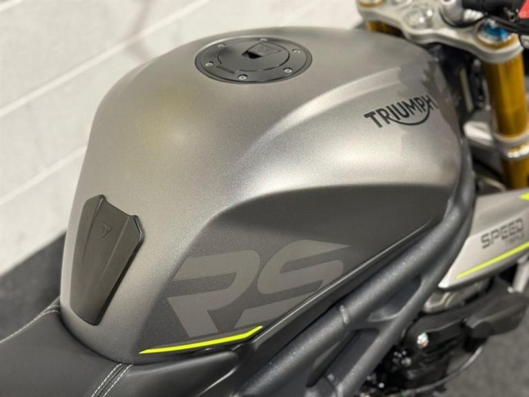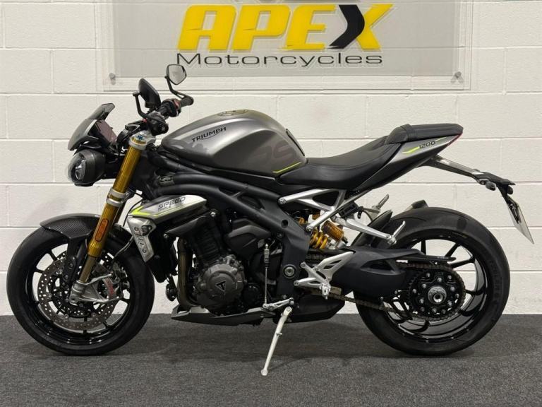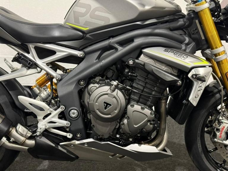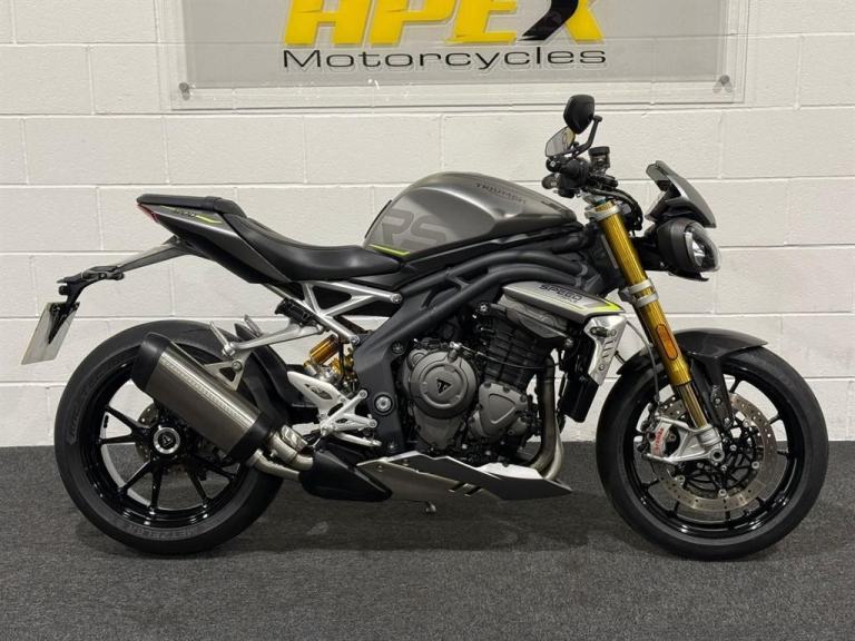 Lovely 1 owner, low mileage example of the massively popular Triumph Speed triple 1200RS. This bikes reputation precedes itself - they are one of the most popular bikes out on UK roads due to their powerful engine, fantastic ergonomics, advanced electronics and brilliant price point. This specific bike has virtually only just been run in and is in stunning condition. It comes equipped with Cruise Control, Heated Grips, Bluetooth, ABS, Riding Modes, Power Modes, Traction Control, TFT Display, Quick Shifter with Auto-Blip, Ohlins Suspension, Carbon Front Mudguard, Bar End Mirrors and a Tank Pad. It comes with all of its keys and books, boasting a full main dealer history and it will be leaving us with a Full Safety Check, a Fresh Service, a 12 Month MOT, a New Pair of Tyres and a 3 Month Warranty. At Apex Motorcycles we are just as passionate as you about motorcycles and we offer the finest selection of used motorcycles available. All our bikes are HPI clear and are mechanically prepared and test ridden through our workshop thoroughly before they leave us. All our bikes come Warranted | UK Mainland Delivery available | Competitive Finance available | P/X always welcome.