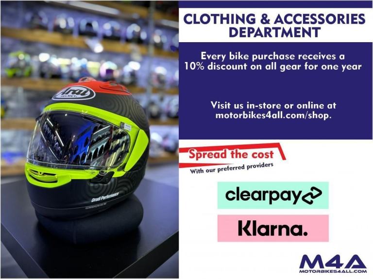 When purchasing a bike from us, you will receive a 10% discount in our clothing, helmets and accessories shop for one year. To see what' in stock, please see: [Website URL removed]