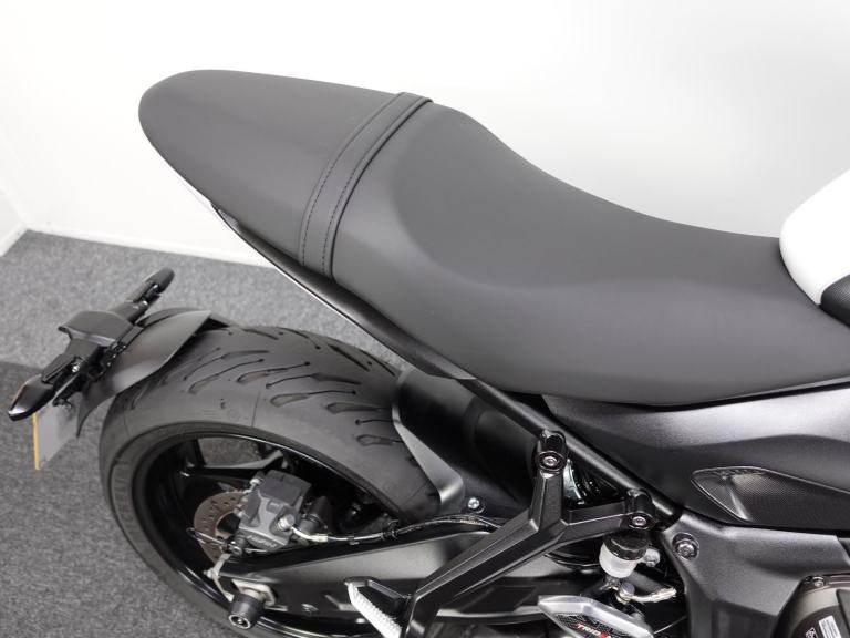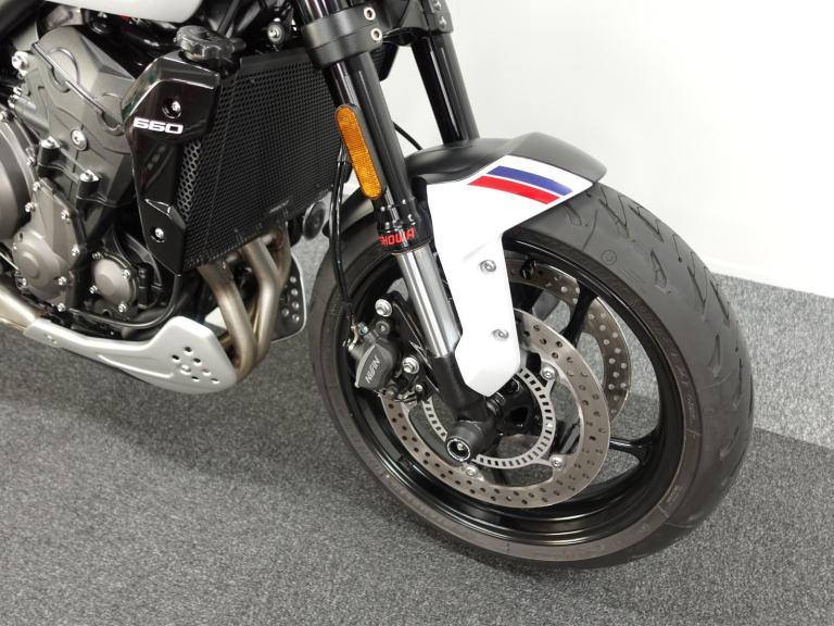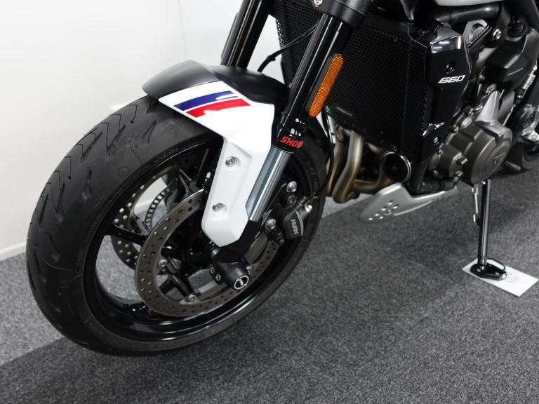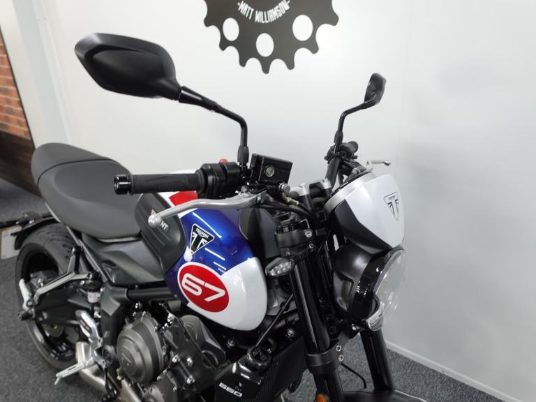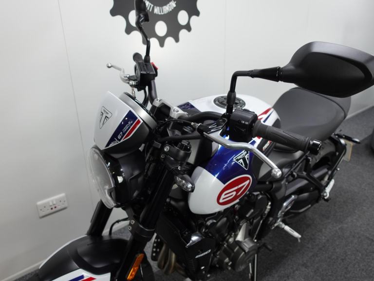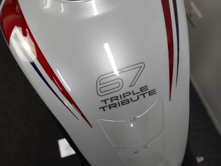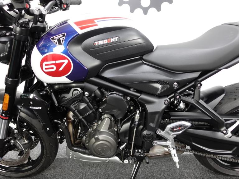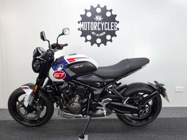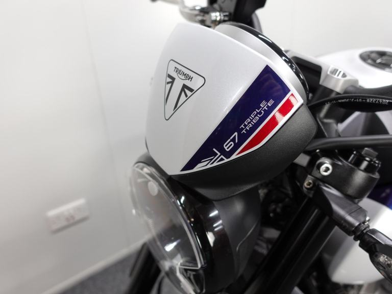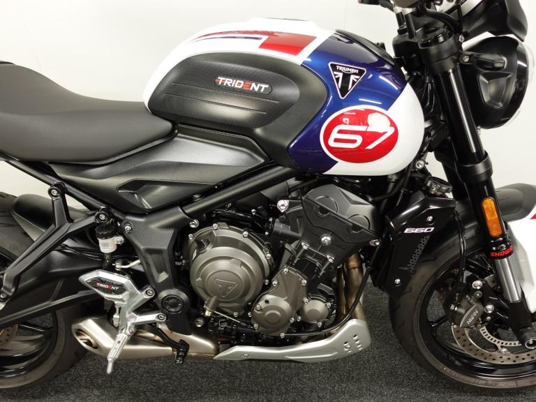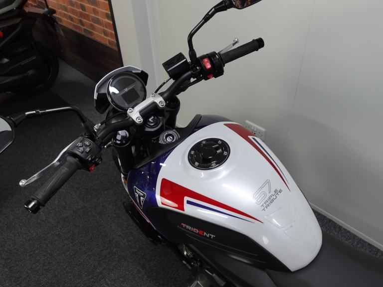 We are pleased to present you with this beautiful Triumph Trident 660. It is a 2024 model, a 1 owner bike with low miles and it is the stunning Triple Tribute special edition. Produced in limited numbers this takes a fantastic bike and takes it up a notch with its eye catching paint scheme! It also benefits from a front fly screen, lower belly pan and the shift assist. On top of that its also comes with a front radiator guard, side stand foot and spindle bobbins.