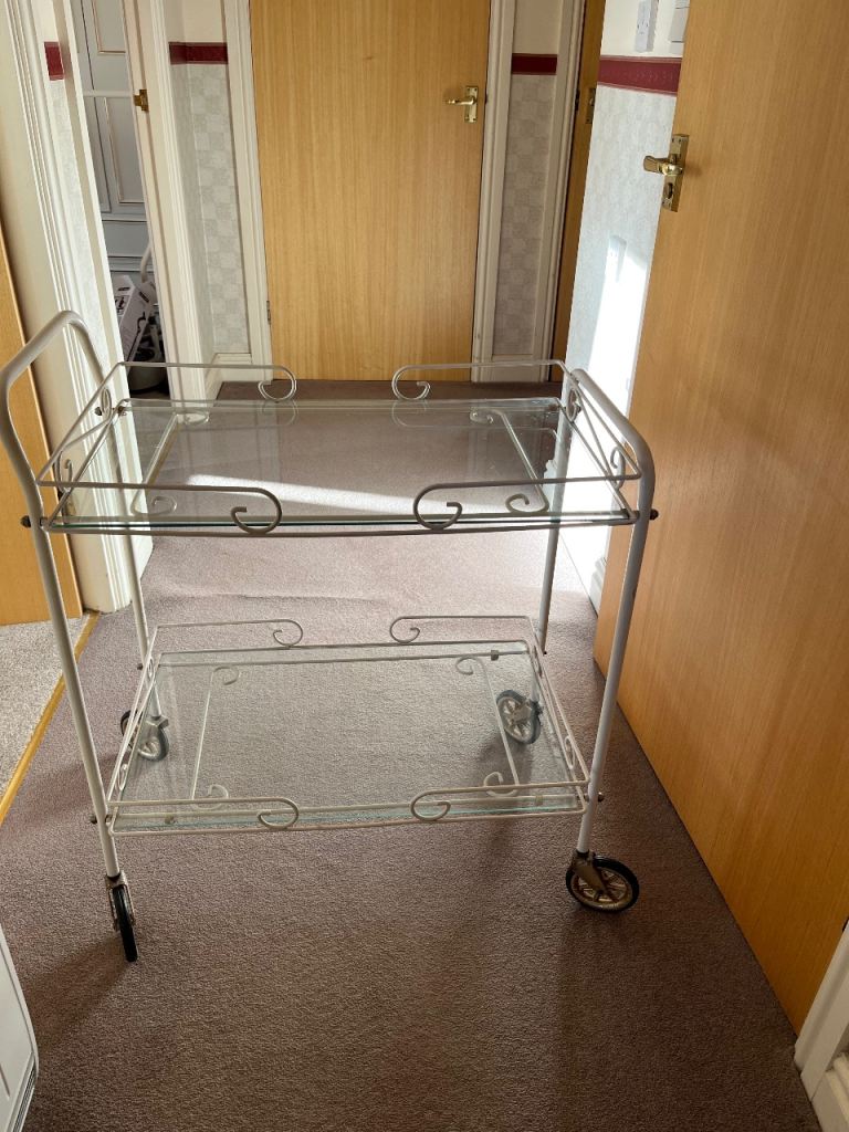 Authentic vintage drinks/dinner trolley. White with glass shelves