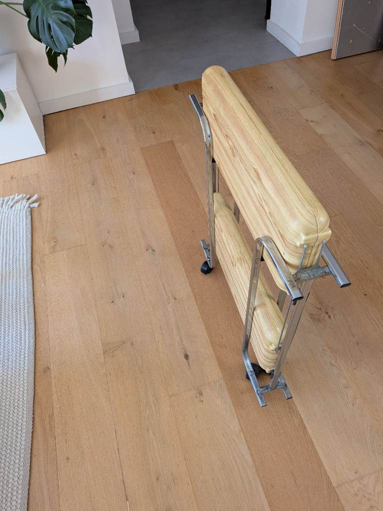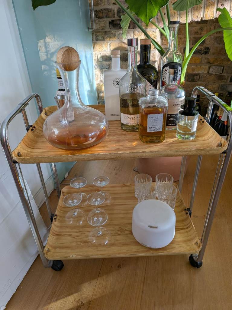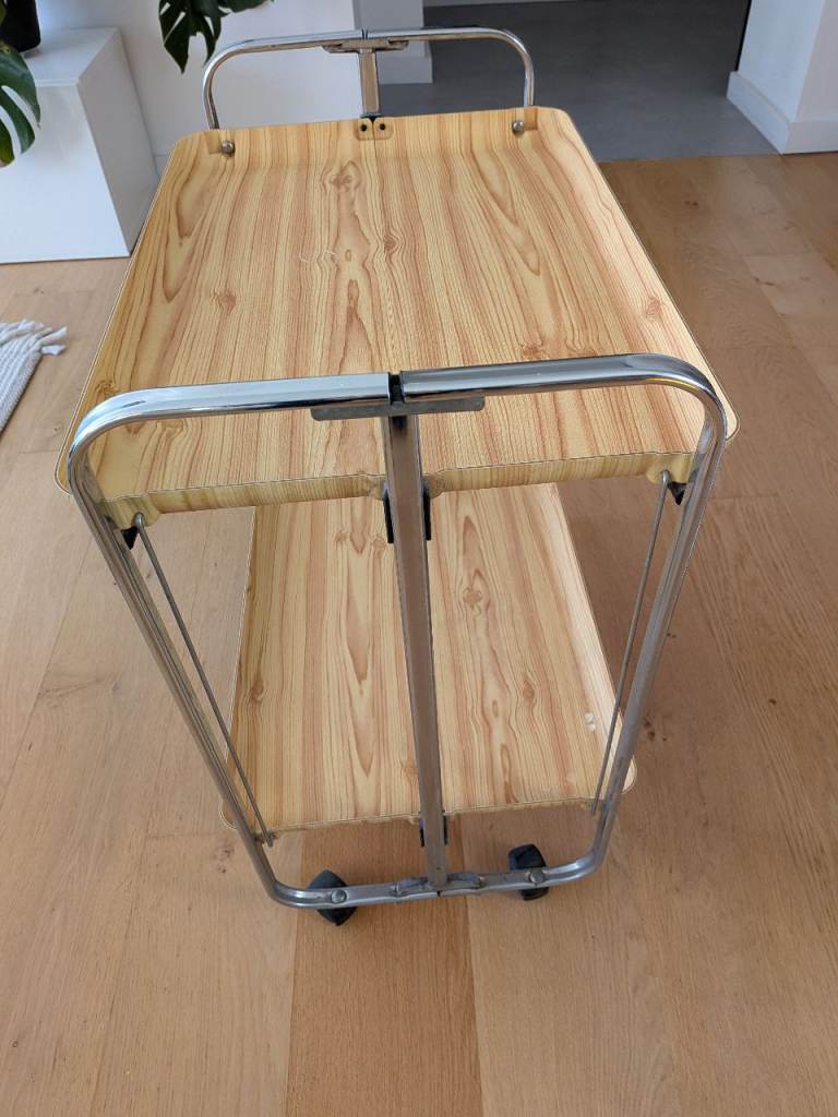 Vintage trolley on wheels. Foldable. About 65 cm high. Fair condition overall, the wood has some marks and the chrome has some spots.