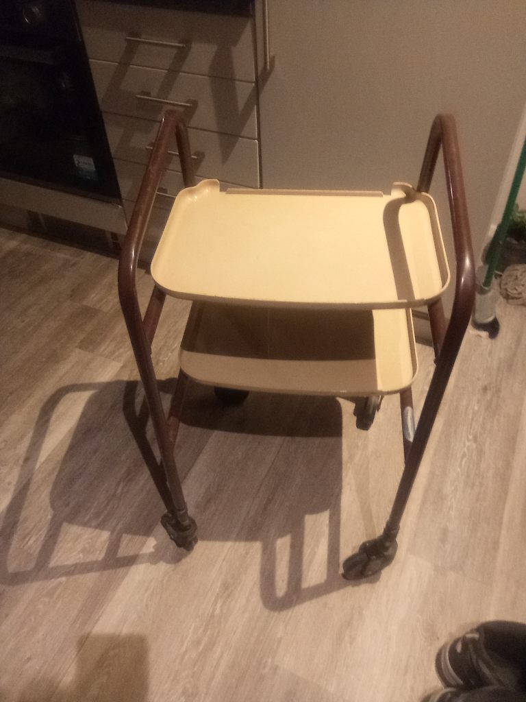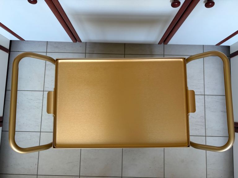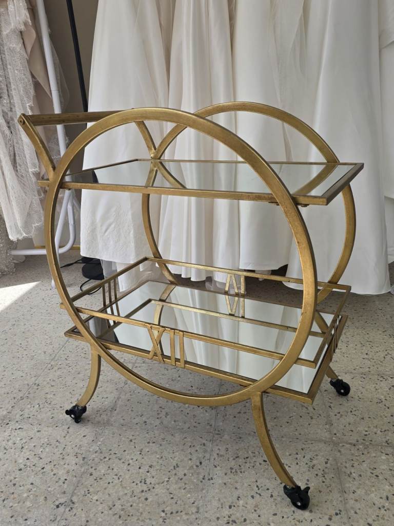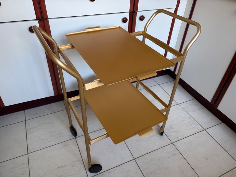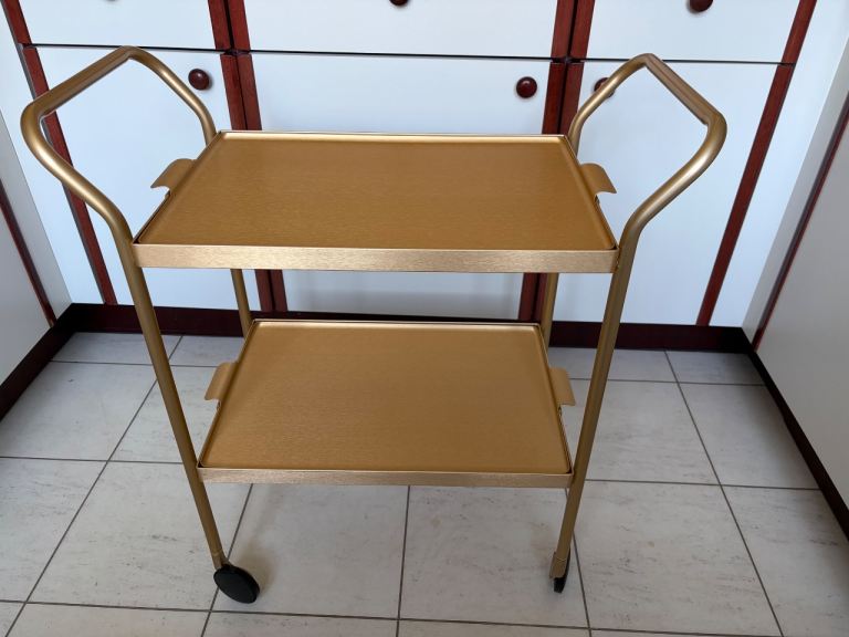 “Kaymet” stainless steel gold coloured tea trolley. 72cm wide, 36cm deep, 80cm high. Trays lift out for easy cleaning 53cm wide, 36cm deep. Top tray height from floor 67cm, bottom tray height from floor 32cm.