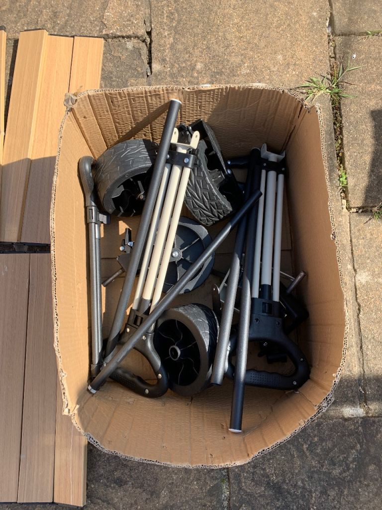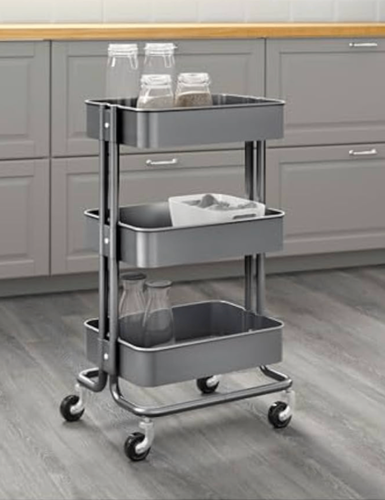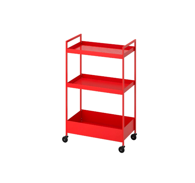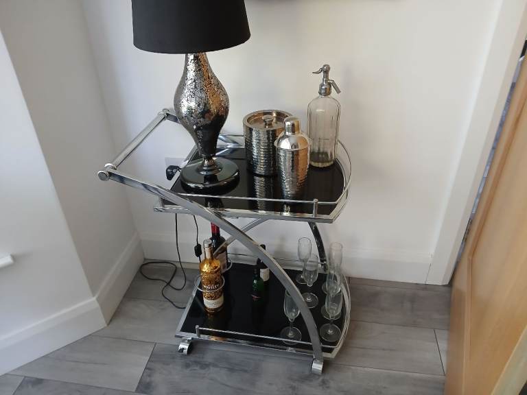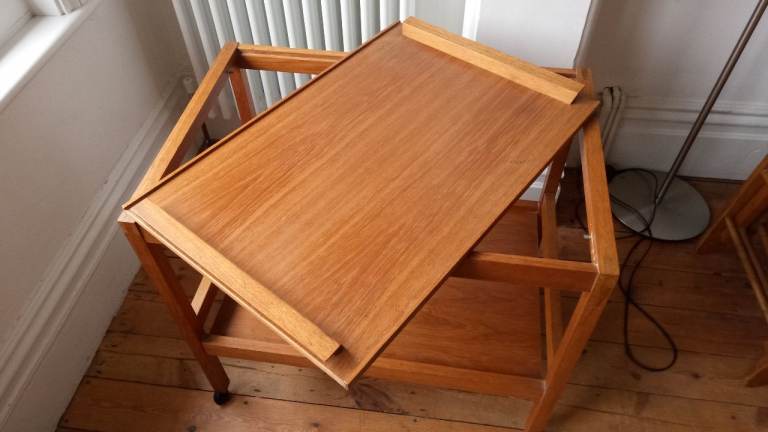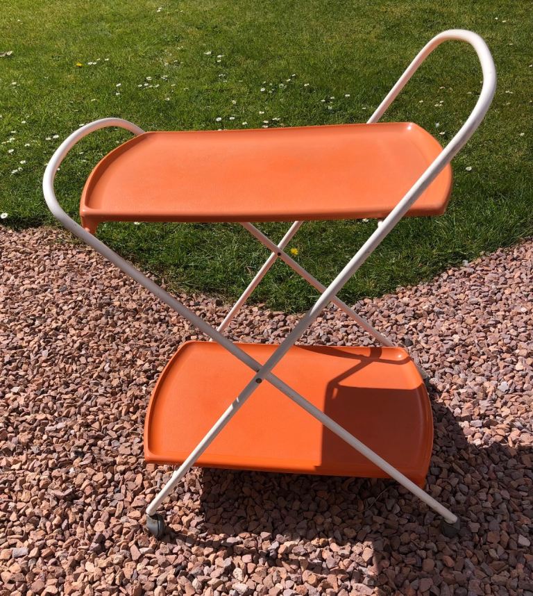 “Kaymet” stainless steel gold coloured tea trolley. 72cm wide, 36cm deep, 80cm high. Trays lift out for easy cleaning 53cm wide, 36cm deep. Top tray height from floor 67cm, bottom tray height from floor 32cm.