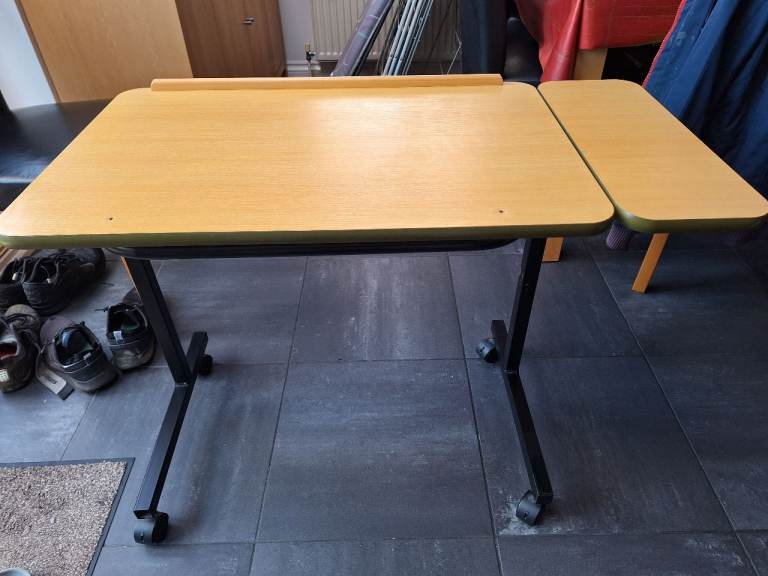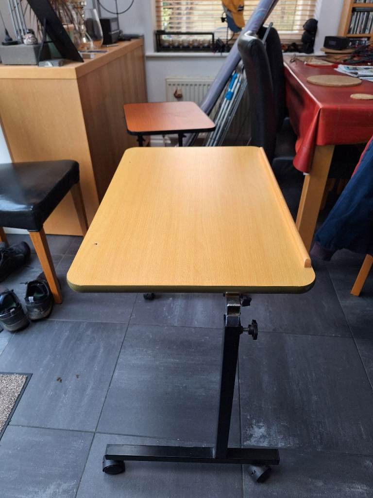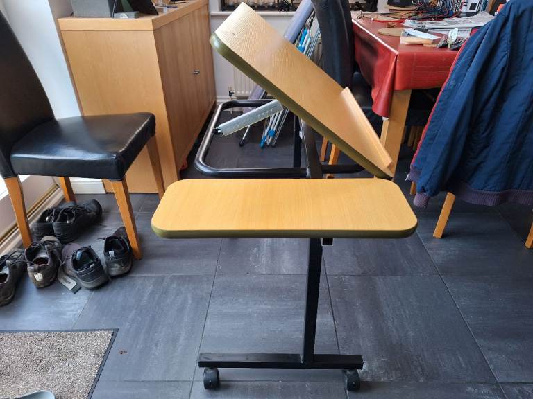 Trolley for dining or working. Can be tilted at various heights for working. Removable side section which is fixed and does not tilt