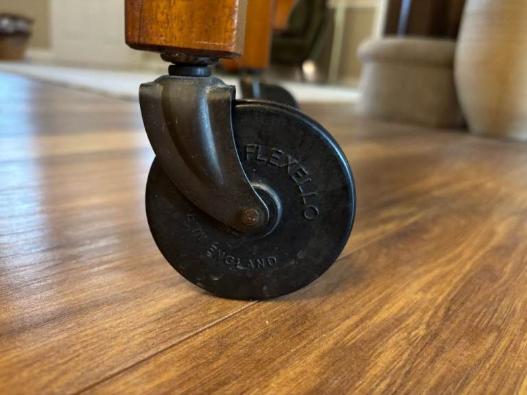 In full working order and in lovely vintage condition with original rotating castors. It has developed a lovely patina. Wood grain believed to be solid oak with formica top. Has the original bakelite handle which pulls out to enable the table to be extended to form a table top. Ideal for many uses from its original use as a tea trolley to a compact table or somewhere to place a jigsaw!