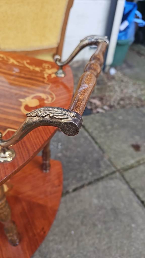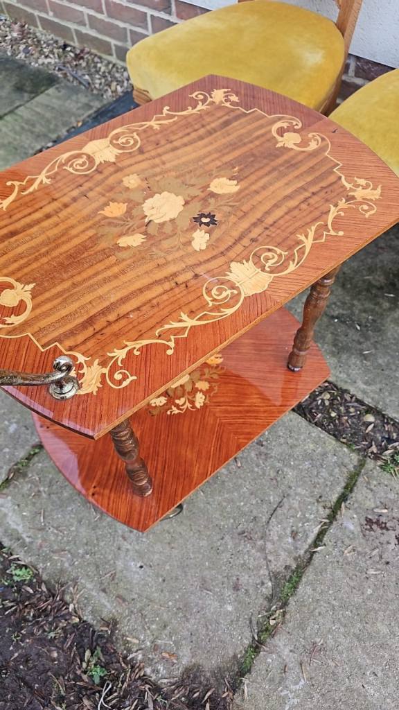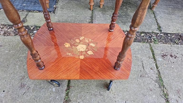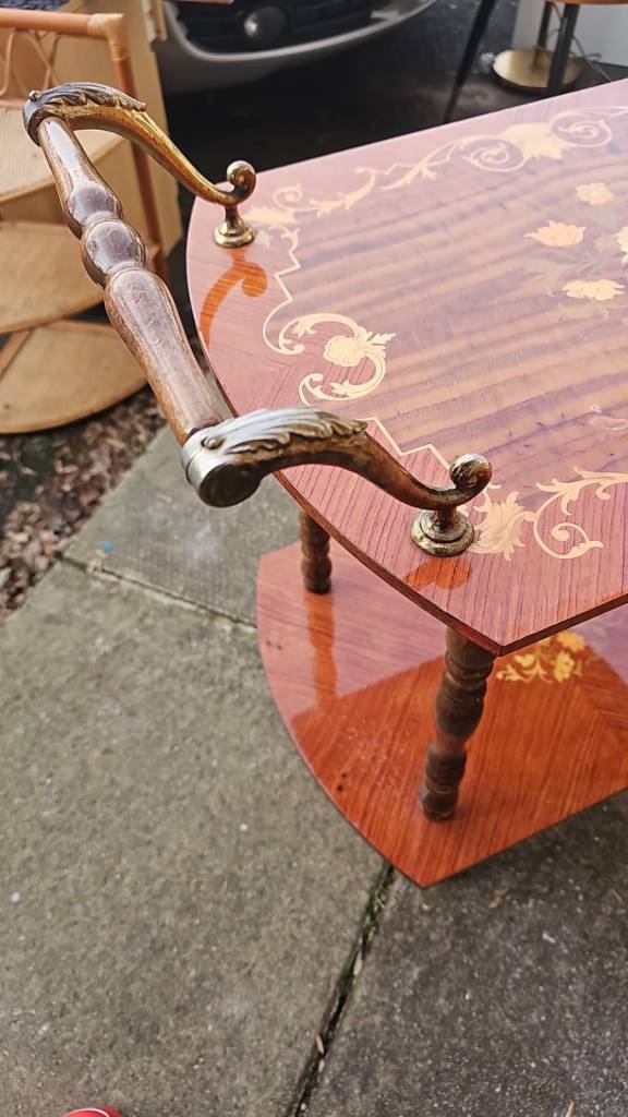 Vintage Italian wooden marquetry and brass bar or tea cart, it’s in good clean sturdy condition some general age related wear. It’s 60 cms wide 38 cms deep and 70 cms tall. We can deliver single items for an extra £7.50 anywhere within Newport or Cardiff. Collection can be made from Malpas Newport NP20.
