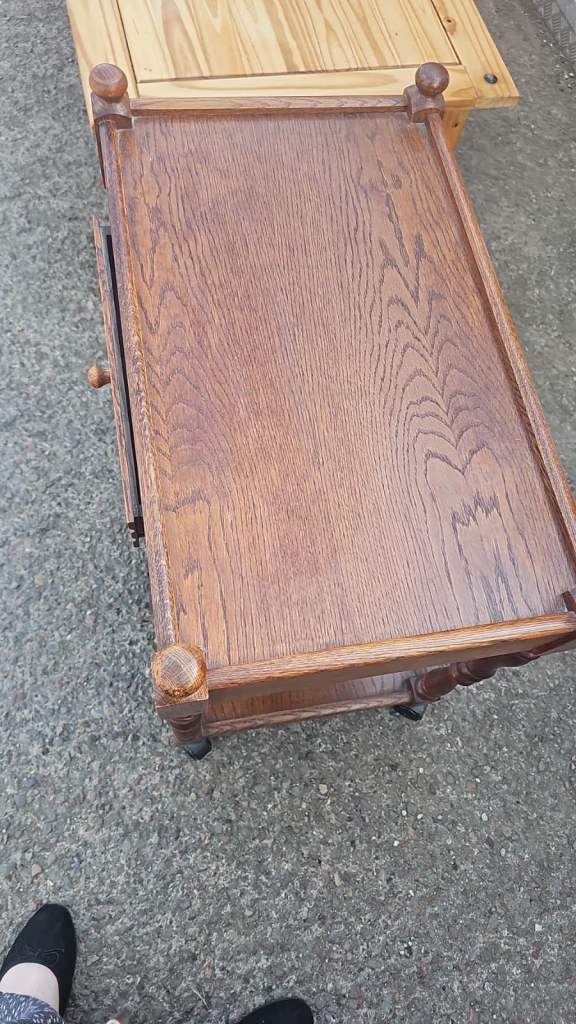 Vintage oak serving trolley its in good clean sturdy condition. Really lovely piece of furniture. It’s 70 cms wide 44 cms deep and 74 cms tall. We can deliver single items for an extra £7.50 anywhere within Newport or Cardiff. Collection can be made from Malpas Newport NP20.