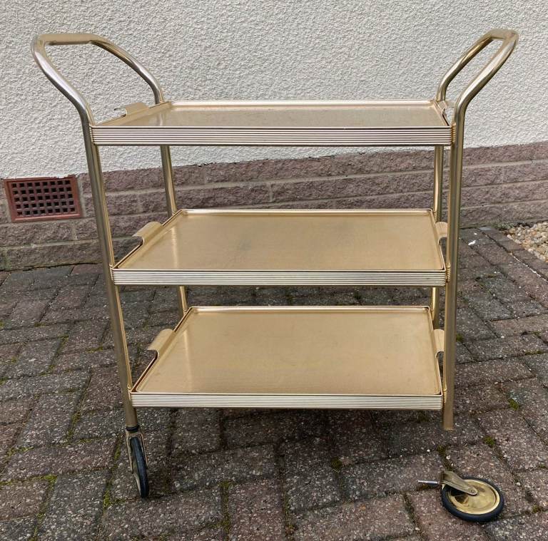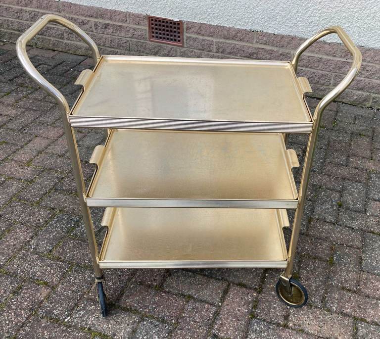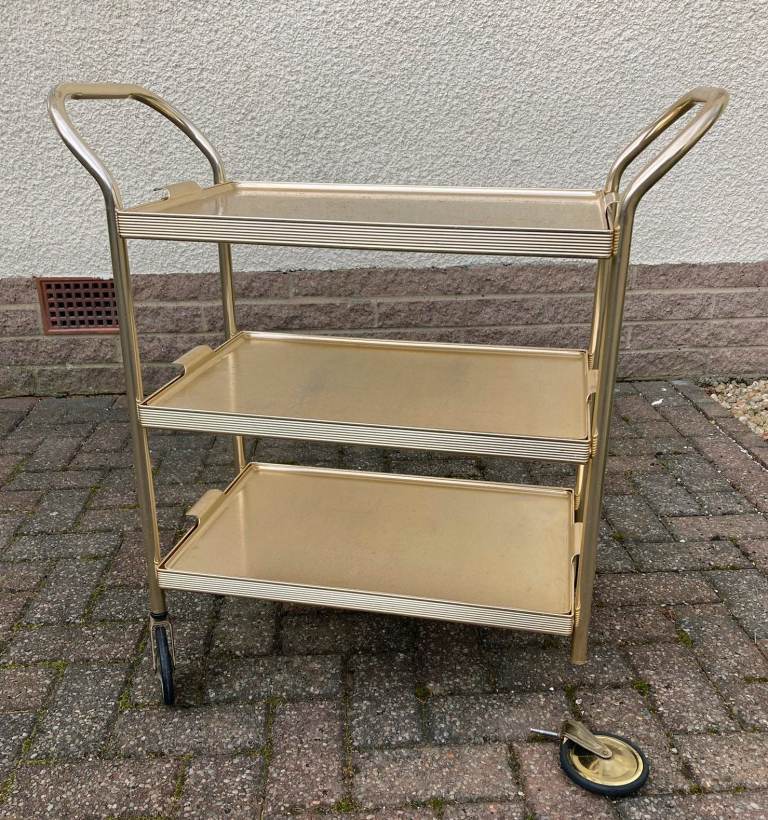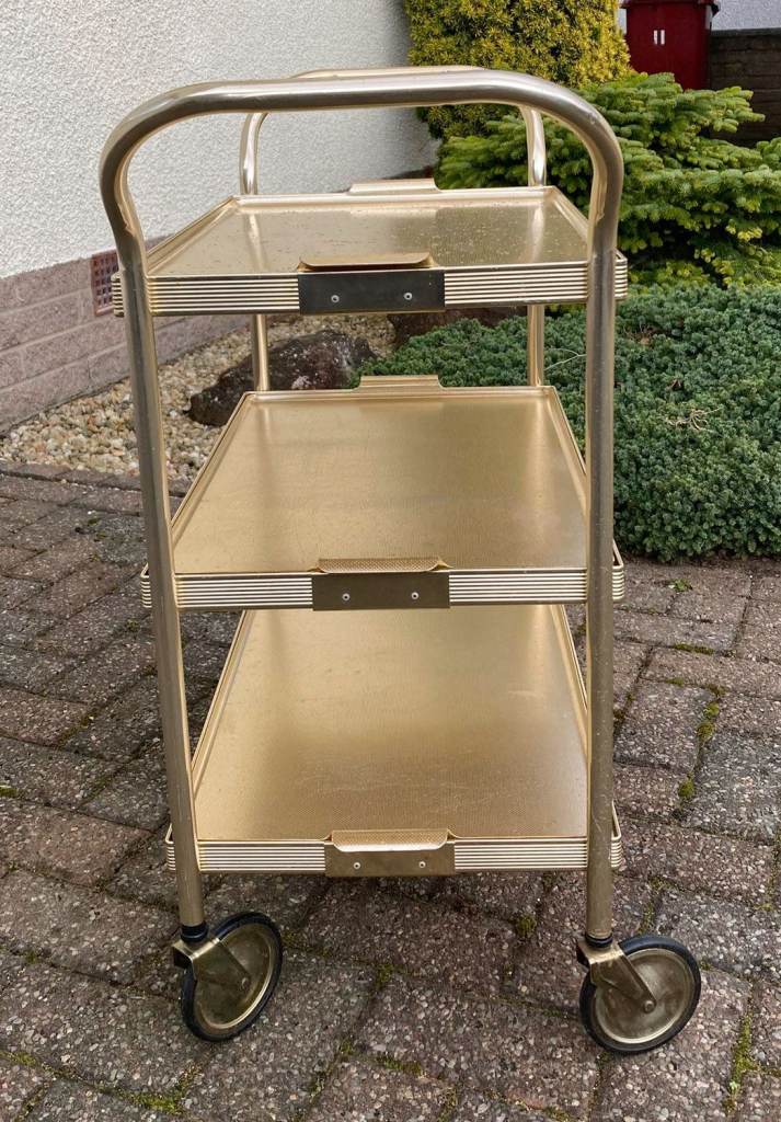 Genuine 1970 three tray wheeled serving trolley. It is made from anodised aluminium in a gold finish. As you can see from the photos, one of the wheels needs repair as it has come out of the down-tube. Otherwise in fair used condition.