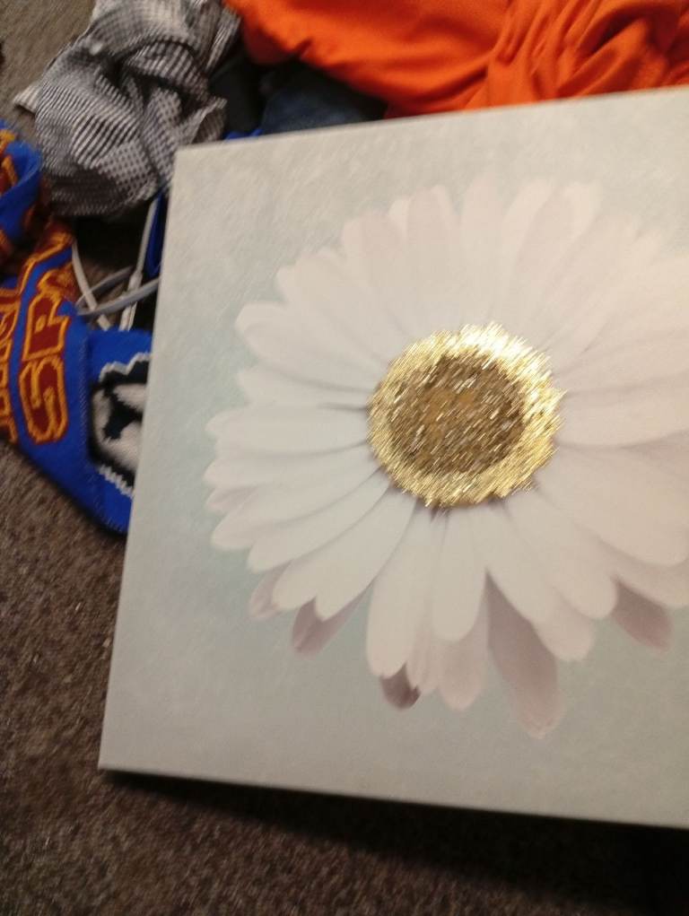 This item appears to be a decorative square canvas print featuring a white daisy with a glittery gold center, commonly categorized as floral home decor wall art.