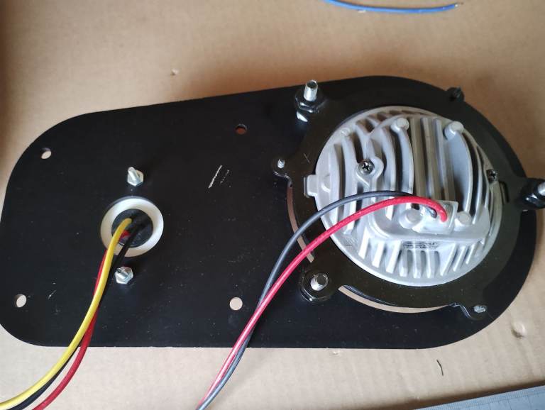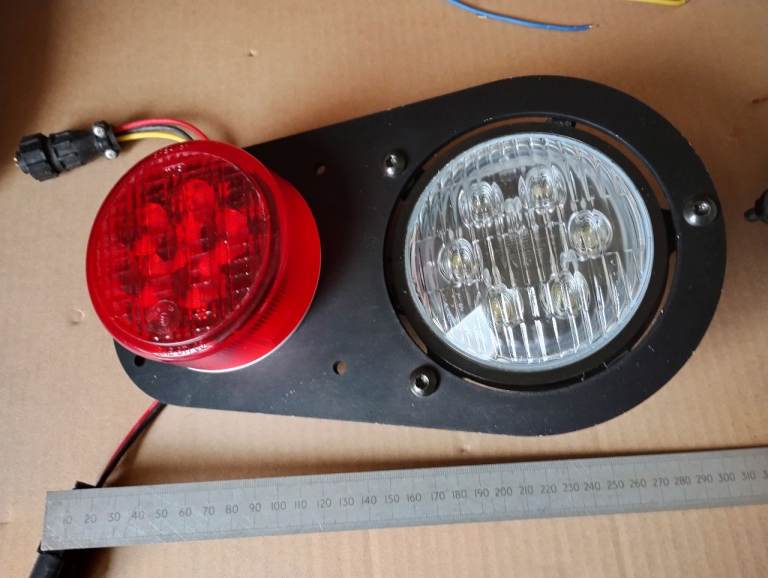 Also from J W Speaker are a pair of rear lights/work lights currently fitted to factory made metal brackets. The worklights are PAR 36 LED, 12-48VDC. 100mm diameter with adjustable sprung directional fixings to 4mm thick black painted mounting brackets. Also on the mounting bracket is a 24v rear & brake light 100mm diameter and 40mm deep.