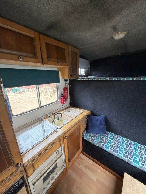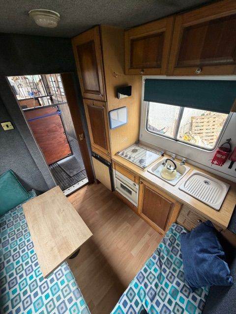 Living area has gas heating, fridge, cooker and hob. Double bed over the Luton. Bench seating with table. Lots of cupboard storage with wardrobe for competition clothes.