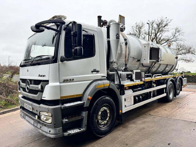 2013 63 MERCEDES AXOR 2533 E5 6x2 rear lift/steer Whale Stainless steel 3300gln vacuum tanker, Jurop PR150 vac pump, stainless lockers, hand wash, work lights, beacons, reverse camera, side sensors, 9T front axle, VPG weigher, 16 speed manual, cruise, diff lock, air seat, electric windows/mirrors, sun roof, ex water board, 11/25 MOT, £39,950 + vat