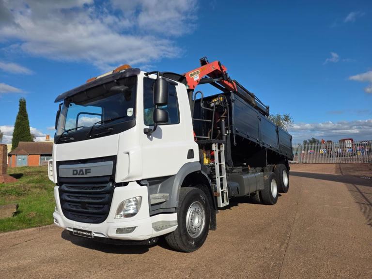 DAF CF 330 2014 (64) EURO 6, DAY CAB, 6X2 TIPPER GRAB, REAR LIFT AXLE, 5.7 MTR TRIPLE DROPSIDE STEEL BODY, ALI SIDES, BARN DOORS, PALFINGER PK 13001 REMOTE CONTROLLED CRANE, 2 EXTENSIONS, UNDERFLOOR HARSH TIPPING GEAR, REVERSING CAMERA, MANUAL GEARBOX, CRUISE CONTROL, TOOL BOX, SUN ROOF, SUN VISOR, BEACONS, AIR CON, STEERING WHEEL CONTROLS, CD, AIR SUSPENSION, 260,000 MILES.