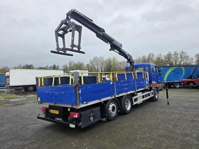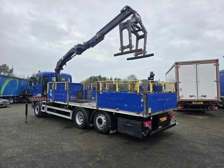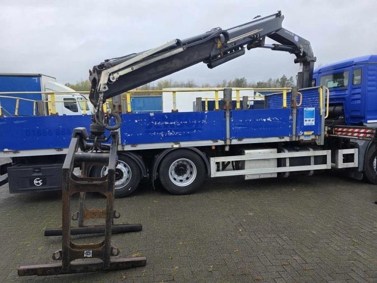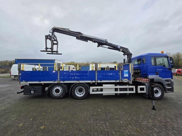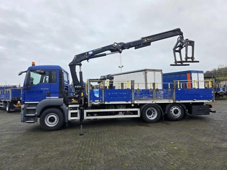 2016 MAN TGS 26.360 6X2 DROPSIDE 20ft Flat with HMF 1420 2 Extension Remote Control Crane with Block Grab mounted behind the cab, Manual 16 Speed gearbox, Camera System, 9 Ton Front Axle, Only 111,081kms, MOT- 31/05/2026