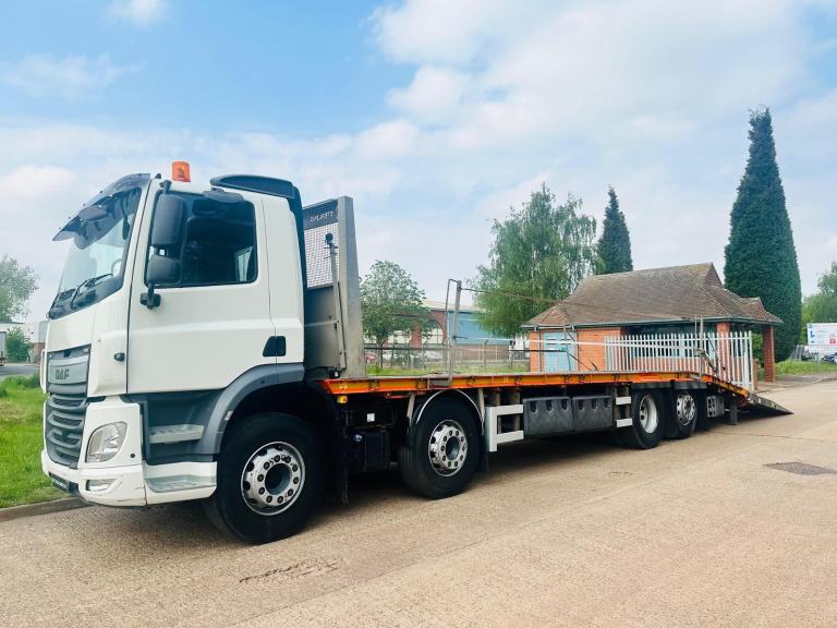DAF CF 400 2017 (67) EURO 6, DAY CAB, 8X2 REAR LIFT & STEER AXLE, 31' STERLING CHEESEWEDGE BEAVERTAIL, REMOTE NOVAWINCH, SAFETY RAILS, CAMERA, AUTO GEARBOX, CRUISE CONTROL, 3 STAGE RETARDER, TOOL BOXES, BEACONS, SUN VISOR, SUN ROOF, AIR CON, AIR SEAT, STEERING WHEEL CONTROLS, ELECTRIC WINDOWS / MIRRORS, CD, AIR SUSPENSION, 80% TYRES, 208,000 MILES.