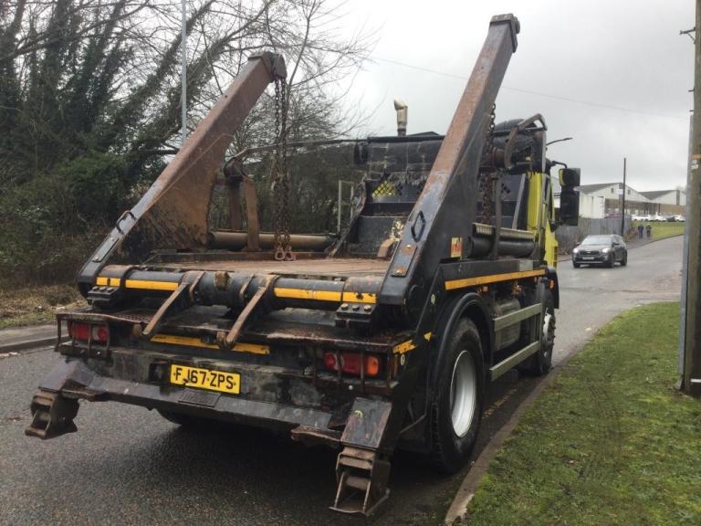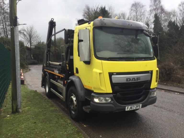 REF TG 3828 REG FJ67ZPS DAF LF 230 EURO 6 300.000 KMS WARRANTED MANUAL 6 SPEED GEARBOX 18 TONNE GROSS AIR CON SUN VISOR SPRING SUSPENSION FITTED WITH HYVA TELESCOPIC ARM SKIP EQUIPMENT EASY SHEET COMES WITH 12 MONTHS MOT VERY GOOD CONDITION ONE COMPANY OWNER NO VAT IF GOING FOR EXPORT REF TG 3828