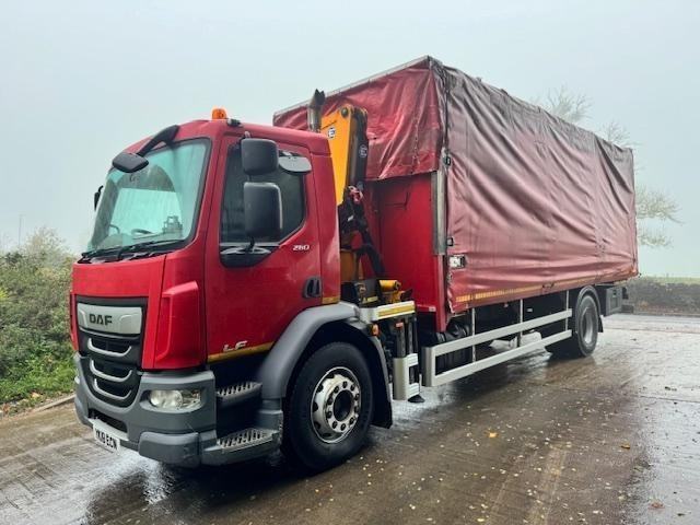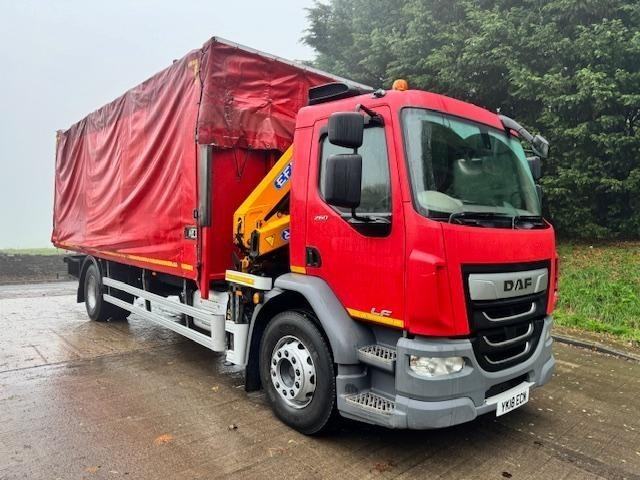 2018 18 DAF LF 260 EURO 6 24FT MW Sliding canopy (removable) flatbed, remote control Effer 100 crane, tool boxes, beacons, upright exhaust, reverse camera, 8 speed manual, lane assist, cruise, diff lock, central locking, air seat, electric windows/mirrors, phone, 1 owner, DAF history, 08/26 MOT, £14,950 + VAT (YK18 ECN)