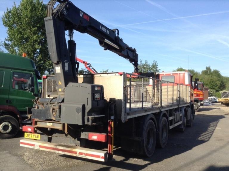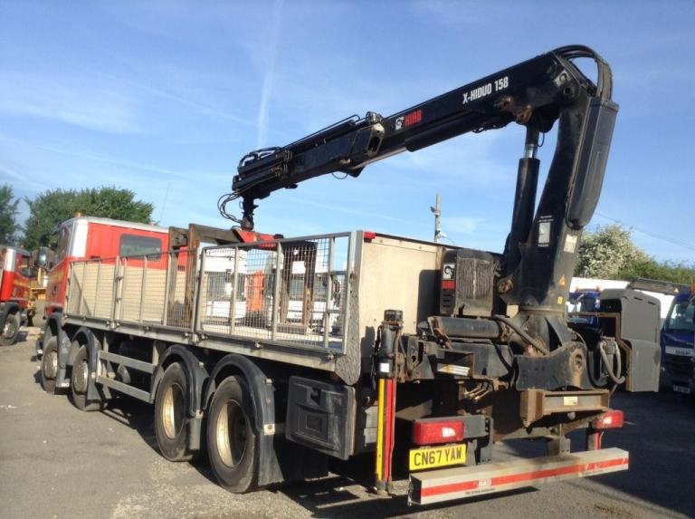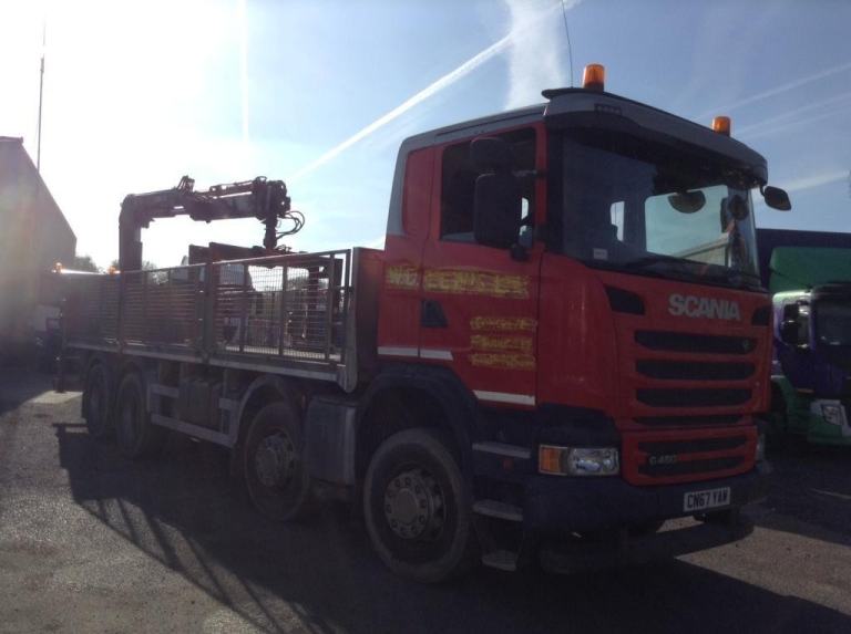 REF TG 3826 REG CN67YAW SCANIA G 450 8X4 DAY CAB MANUAL GERABOX FITTED WITH ALUMINIUM CAGE DROPSIDE FLAT AND REAR MOUNTED HIAB 158 CRANE WITH BRICK GRAB RADIO REMOTE CONTROLL ONE COMPANY OWNER VERY GOOD CONDITION FULL SERVICE HISTORY NO VAT IF GOING FOR EXPORT REF TG 3826