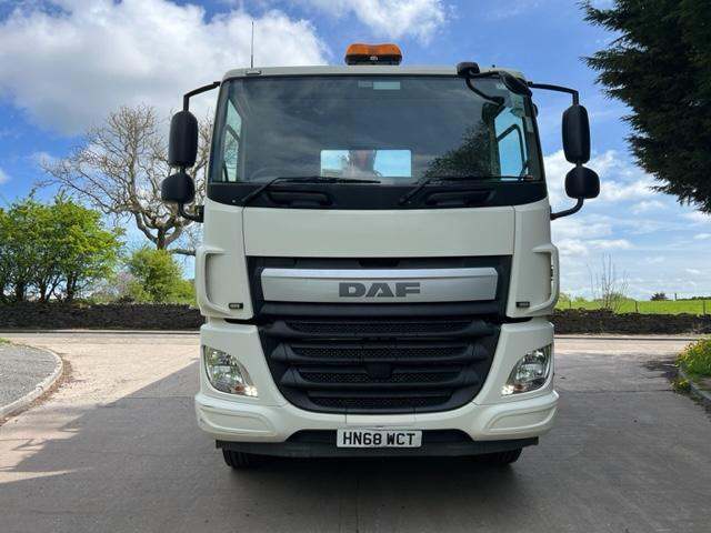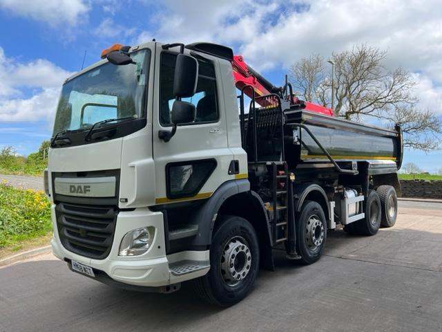 2018 68 DAF CF 400 Euro 6 8x4 Abba steel tipper, sheet, Epsilon M125L crane & grab, Wacker carrier, tow bar, tool box, side guards, sensor system, camera system, audible indication, bottom door glass, Auto, central locking, air seat, air con, sun roof, electric windows/mirrors, phone, cruise, hill assist, 1 owner, £54,950 + vat