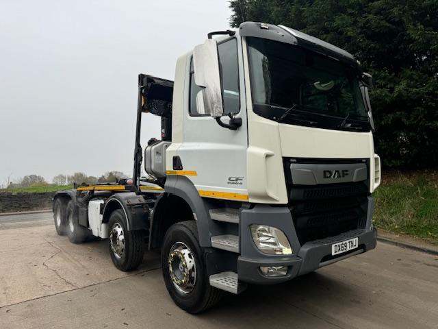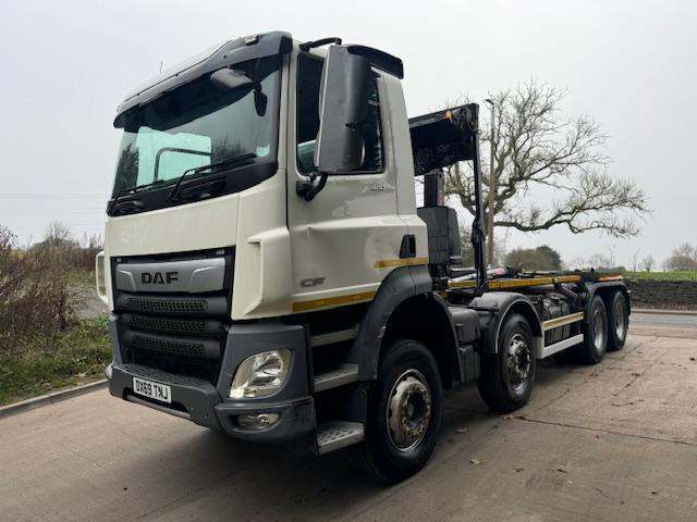 2019 69 DAF CF 480 EURO 6 8x4 hub reduction, Multi-Lift Ultima 24 hook loader, sheet, VBG draw bar coupling, tool box, beacons, work lights, camera system, sun visor, Auto, cruise, hill assist, central locking, heated air seat, air con climate control, sun roof, electric windows/mirrors, ex council, £39,950 + vat